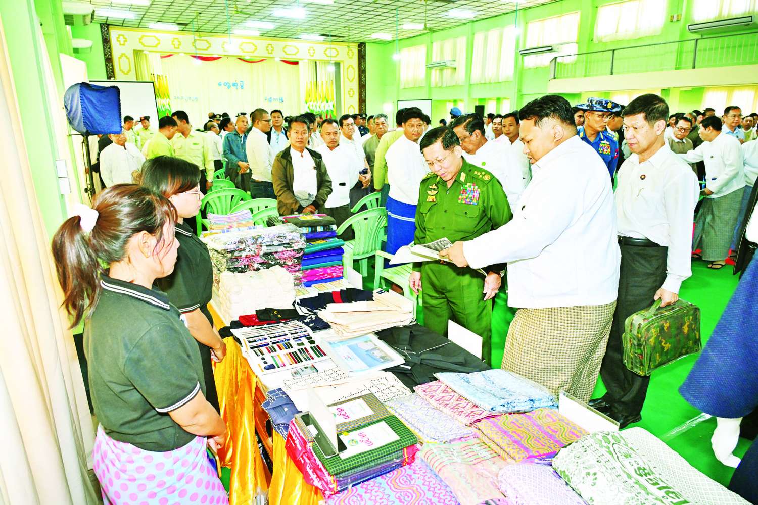 ယင်းနောက် နိုင်ငံတော်စီမံအုပ်ချုပ်ရေးကောင်စီဥက္ကဋ္ဌ နိုင်ငံတော်ဝန်ကြီးချုပ်သည် ခင်းကျင်းပြသထားသည့် ဒေသထွက်ကုန်ပစ္စည်းများ၊ စားသောက်ကုန်၊ လူသုံးကုန်၊ အဝတ်အထည်များနှင့် ဝါသီးနှံထုတ်ကုန်ပစ္စည်းများ ခင်းကျင်းပြသထားရှိမှုများကိုကြည့်ရှုခဲ့ပြီး ဈေးကွက်ရရှိမှုအခြေအနေများကို မေးမြန်းဆွေးနွေးရာ လုပ်ငန်းအလိုက် စီးပွားရေးလုပ်ငန်းရှင်များက လိုက်လံရှင်းလင်းတင်ပြခဲ့ကြောင်း သတင်းရရှိသည်။