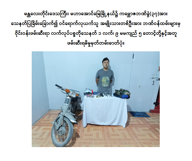 မန္တလေးတိုင်းဒေသကြီး၊ မဟာအောင်မြေမြို့နယ်၌ ကမ္ဘောဇဘဏ်ခွဲ (၃၇) အား သေနတ်ပြခြိမ်းခြောက်၍ ဝင်ရောက်လုယက်သူ အမျိုးသားတစ်ဦးအား ဘဏ်ဝန်ထမ်းများမှ ဝိုင်းဝန်းဖမ်းဆီးရာ လက်လုပ်ပစ္စတိုသေနတ် ၁ လက်၊ ၉ မမကျည် ၅ တောင့်တို့နှင့်အတူ ဖမ်းဆီးရမိ