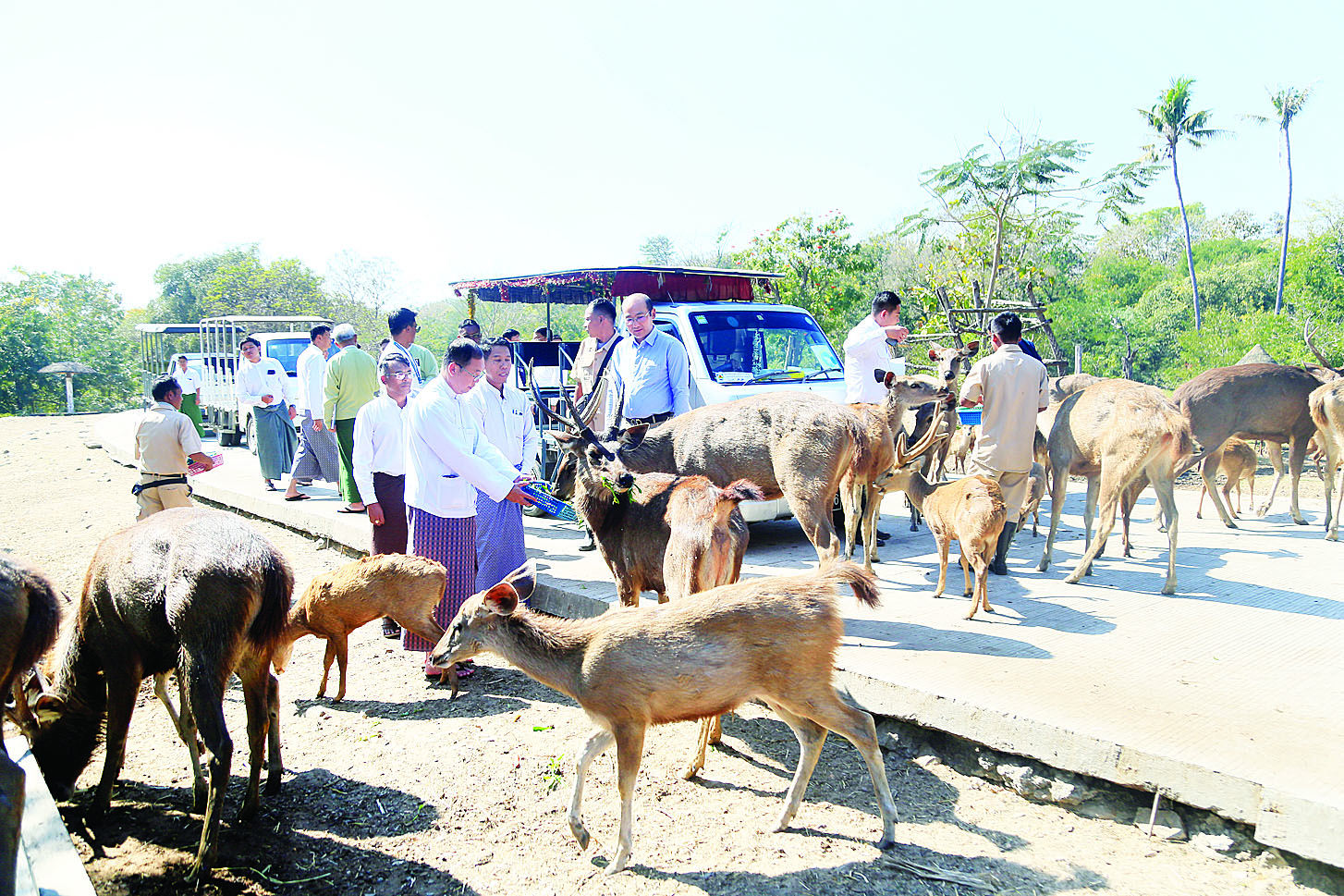 ထို့နောက် ပြည်ထောင်စုဝန်ကြီးသည် နေပြည်တော်တိရစ္ဆာန်ဥယျာဉ် ရှင်းလင်းဆောင်၌ တာဝန်ရှိသူများနှင့်တွေ့ဆုံပြီး နေပြည်တော်တိရစ္ဆာန်ဥယျာဉ်နှင့် ဆာဖာရီဥယျာဉ်တို့ကို ပြည်သူများ လာရောက်အပန်းဖြေအနားယူနိုင်ရန်၊ ဗဟုသုတရစေရန်နှင့် ပတ်ဝန်းကျင်ဆိုင်ရာ ဂေဟစနစ်သဘော တရားများကို သိရှိနားလည်စေရန် ရည်ရွယ်တည်ထောင်ခဲ့ခြင်းဖြစ်ကြောင်း၊ ကျောင်းသား ကျောင်းသူများ သတ္တဗေဒနှင့် ရုက္ခဗေဒဆိုင်ရာပညာရပ်များ လေ့လာသင်ယူမှုနှင့် သုတေသနဆိုင်ရာ လုပ်ငန်းများအတွက်လည်း များစွာအထောက်အကူပြုကြောင်း၊ ဥယျာဉ်အတွင်းရှိ တိရစ္ဆာန်များ၏ ကျန်းမာရေးကို ပုံမှန်စစ်ဆေးမှုများ ပြုလုပ်သွားရန်နှင့် အစားအစာများအား သတ်မှတ်ချက်များနှင့်အညီ ဂရုတစိုက်ကျွေးမွေးစောင့်ရှောက်သွားရန်လိုကြောင်း၊ ထို့ပြင် ရှားပါး၍ မျိုးသုဉ်းရန်အန္တရာယ်ရှိသည့် မျိုးစိတ်များ မျိုးဆက်ပြန့်ပွားနိုင်ရန်အတွက် ထိန်းသိမ်းမွေးမြူသွားရမည်ဖြစ်ကြောင်း မှာကြားသည်။