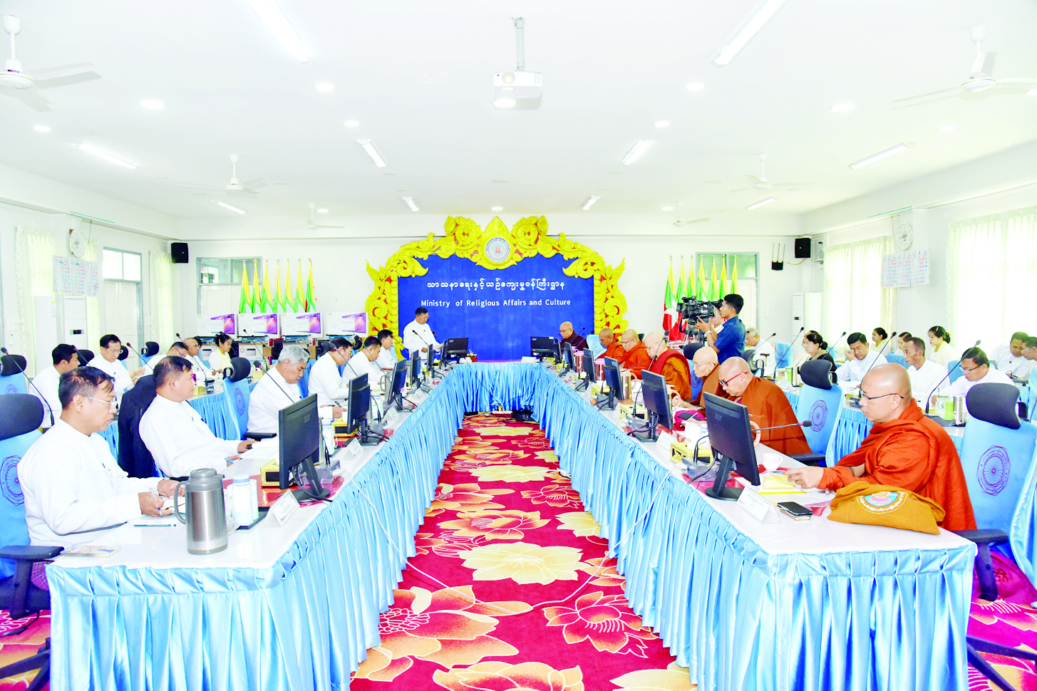ဦးစွာ သာသနာရေးနှင့်ယဉ်ကျေးမှုဝန်ကြီးဌာန ပြည်ထောင်စုဝန်ကြီးက သာသနာတော်ဆိုင်ရာများကို ဆွေးနွေးလျှောက်ထားပြီး သာသနာတော် ထွန်းကားပြန့်ပွား ရေးဦးစီးဌာန ညွှန်ကြားရေးမှူးချုပ်က ပိဋကတ်သုံးပုံ အင်္ဂလိပ်ဘာသာပြန်ဆို ဆောင်ရွက်မှုလုပ်ငန်းများနှင့်ပတ်သက်၍ ရှင်းလင်းလျှောက်ထားတင်ပြသည်။