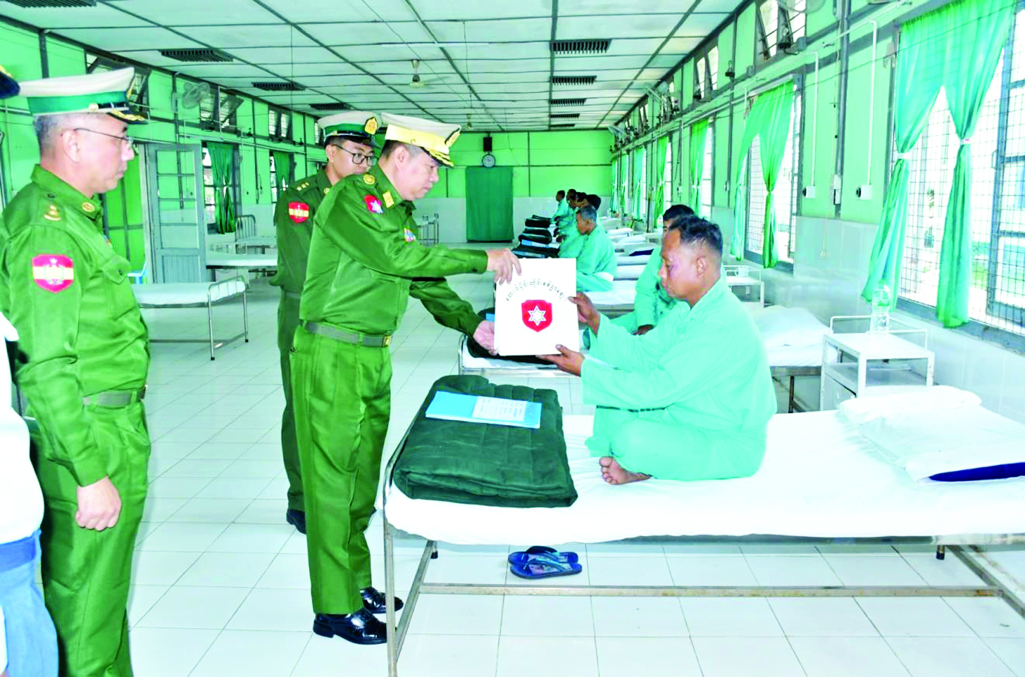 နေပြည်တော်ကောင်စီနယ်မြေ ဇေယျာသီရိမြို့နယ်ရှိ တပ်မတော်ဆေးရုံကြီး ခုတင်-၁၀၀၀၊ ရှမ်းပြည်နယ်(တောင်ပိုင်း) ခိုလမ်မြို့ရှိ နယ်မြေခံဆေးတပ်ရင်း၊ ရန်ကုန်တိုင်းဒေသကြီး မင်္ဂလာဒုံမြို့နယ်ရှိ တပ်မတော်အရိုးရောဂါအထူးကုဆေးရုံကြီး ခုတင်-၅၀၀ နှင့် တပ်မတော်ဆေးရုံကြီး ခုတင်-၁၀၀၀၊ ပဲခူးတိုင်းဒေသကြီး တောင်ငူမြို့နှင့် ပြည်မြို့တို့ရှိ တပ်မတော်ဆေးရုံတို့၌ တက်ရောက်ကုသမှုခံယူလျက်ရှိသော အရာရှိ၊ စစ်သည်၊ မိသားစုများ၊ မြန်မာနိုင်ငံရဲတပ်ဖွဲ့ဝင်များနှင့် ဒေသခံပြည်သူများအား ယနေ့တွင် သက်ဆိုင်ရာတိုင်းစစ်ဌာနချုပ်များမှ တိုင်းမှူးများနှင့် တာဝန်ရှိသူများက သွားရောက်ကြည့်ရှု၍ တစ်ဦးချင်း၏ ရောဂါဖြစ်ပွားမှု၊ ဆေးဝါးကုသပေးထားမှုနှင့် ကျန်းမာရေးတိုးတက်ကောင်းမွန်မှု အခြေအနေများကို မေးမြန်းအားပေးစကားပြောကြားပြီး အာဟာရဖြည့်စားသောက်ဖွယ်ရာများနှင့် ချီးမြှင့်ငွေများပေးအပ်သည်။