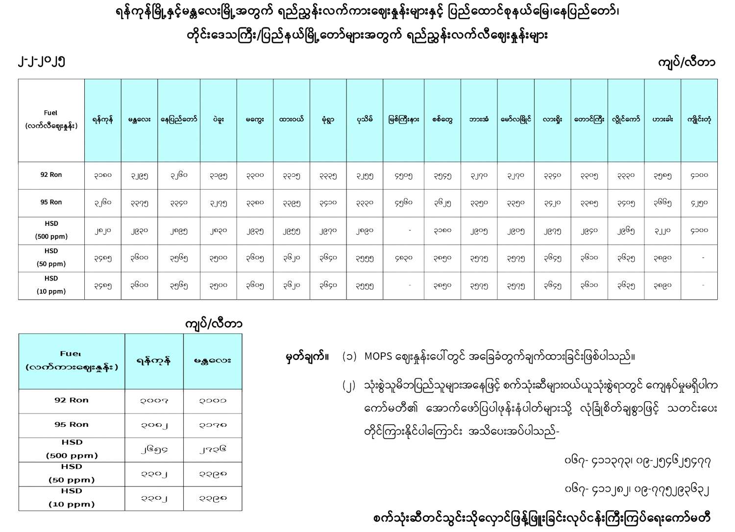 ရန်ကုန်မြို့နှင့် မန္တလေးမြို့အတွက် ရည်ညွှန်းလက်ကားဈေးနှုန်းများနှင့် ပြည်ထောင်စုနယ်မြေ နေပြည်တော်၊ တိုင်းဒေသကြီး/ ပြည်နယ် မြို့တော်များအတွက် ရည်ညွှန်းလက်လီဈေးနှုန်းများ 02/02/2025