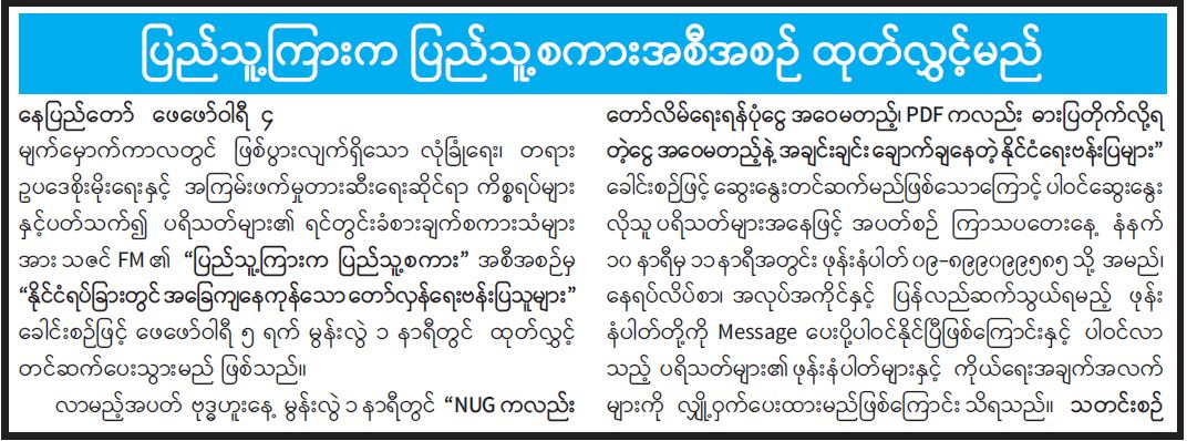 မျက်မှောက်ကာလတွင် ဖြစ်ပွားလျက်ရှိသော လုံခြုံရေး၊ တရားဥပဒေစိုးမိုးရေးနှင့် အကြမ်းဖက်မှုတားဆီးရေးဆိုင်ရာ ကိစ္စရပ်များနှင့်ပတ်သက်၍ ပရိသတ်များ၏ ရင်တွင်းခံစားချက်စကားသံများအား သဇင် FM ၏ “ပြည်သူ့ကြားက ပြည်သူ့စကား” အစီအစဉ်မှ “နိုင်ငံရပ်ခြားတွင် အခြေကျနေကုန်သော တော်လှန်ရေးဗန်းပြသူများ” ခေါင်းစဉ်ဖြင့် ဖေဖော်ဝါရီ ၅ ရက် မွန်းလွဲ ၁ နာရီတွင် ထုတ်လွှင့်တင်ဆက်ပေးသွားမည်ဖြစ်သည်။