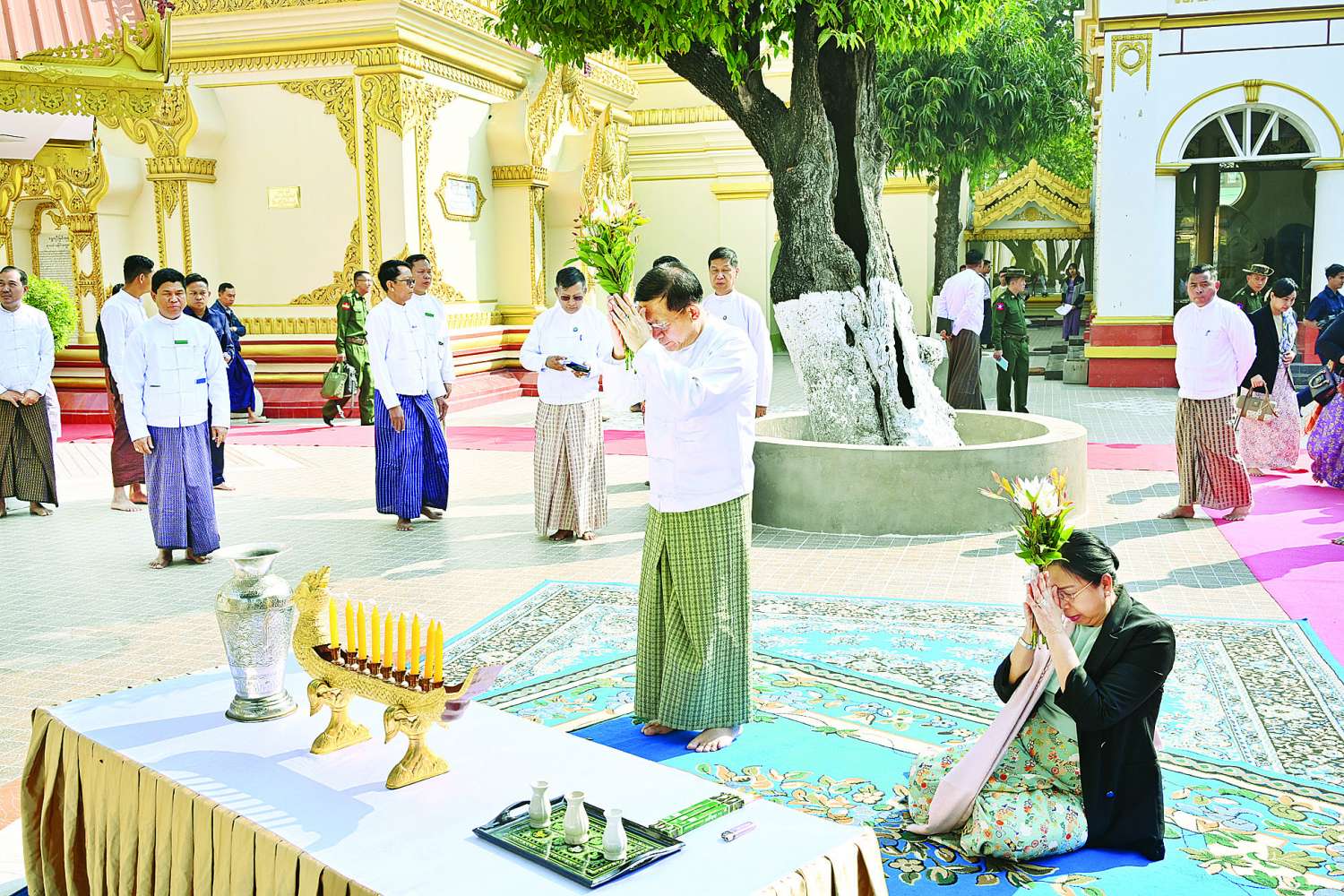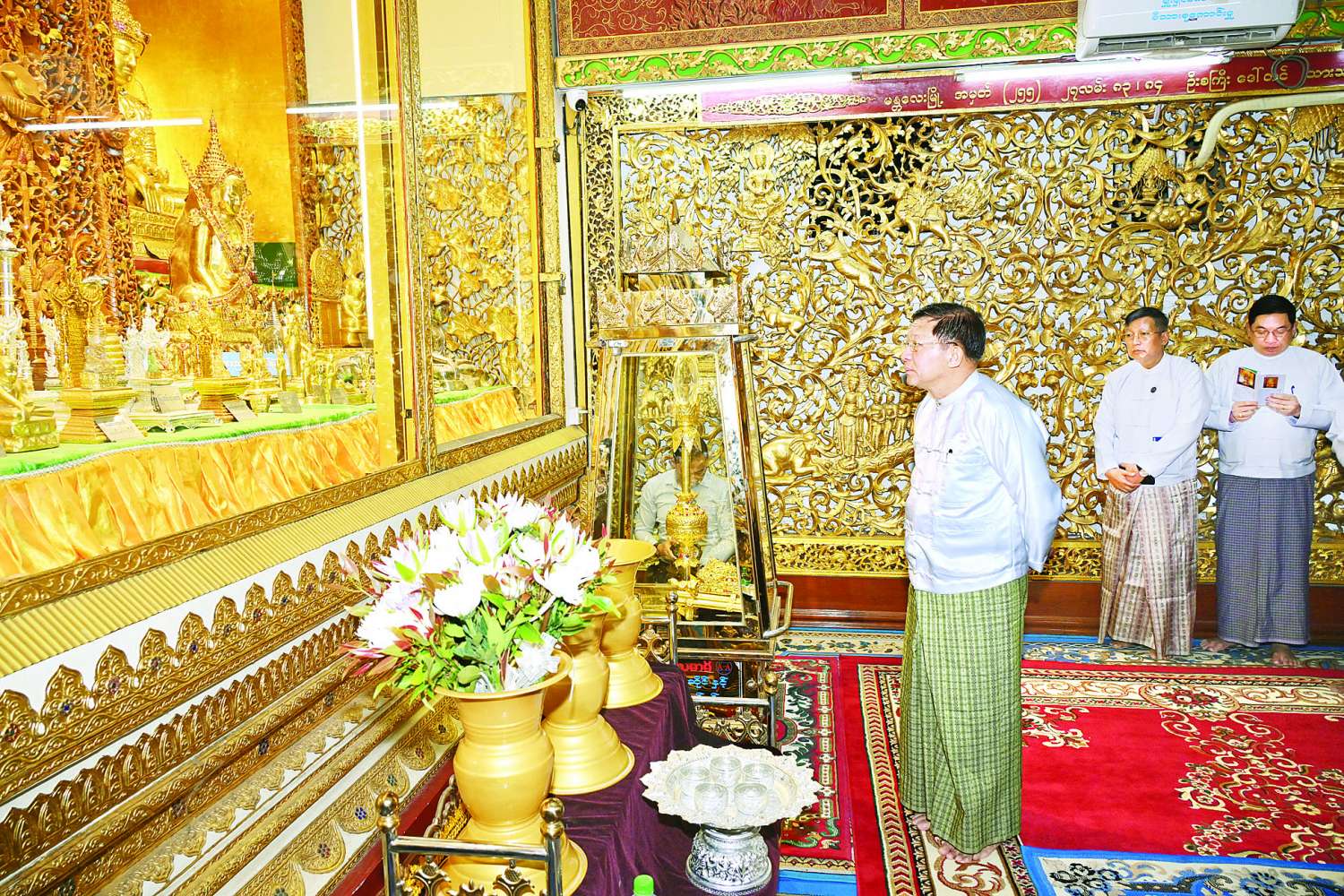 ထို့နောက် နိုင်ငံတော်စီမံအုပ်ချုပ်ရေးကောင်စီဥက္ကဋ္ဌ နိုင်ငံတော်ဝန်ကြီးချုပ်နှင့် ဇနီး၊ အဖွဲ့ဝင်များသည် မန္တလေးမြို့ရှိ ရွှေကျီးမြင်ဘုရားသို့ရောက်ရှိကြပြီး ရှေးမြန်မာမင်းမြတ်တို့ ထီးနန်းစဉ်ဆက်ကိုးကွယ်တော်မူခဲ့သည့် မြန်မာပြည်အရပ်ရပ်မှ ဆုတောင်းပြည့်ဆင်းတုတော်များ ကိန်းဝပ်စံပ္ပါယ်တော်မူရာ လိုဏ်ဂူတော်အတွင်းရှိ ရွှေကျီးမြင် ရုပ်ပွားတော်အပါအဝင် အညာသီဟတောဘုရား၊ ရွှေကွန်အုပ်ဘုရား၊ မြသိန်းတန်မြတ်စွာဘုရား၊ ရွှေလင်းပင်ဘုရားနှင့် အခြားမြတ်စွာဘုရား၏ ဗုဒ္ဓရုပ်ပွားတော်မြတ်များကို ဖူးမြော်ကြည်ညိုပြီး ပန်း၊ ရေချမ်း ကပ်လှူပူဇော်သည်။