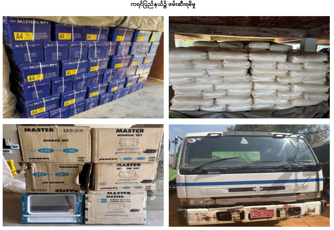 ထို့အပြင် ဖေဖော်ဝါရီလ ၁၂ ရက်တွင် ကရင်ပြည်နယ်တရားမဝင်ကုန်သွယ်မှုတိုက်ဖျက်ရေးအထူးအဖွဲ့၏ စီမံခန့်ခွဲမှုဖြင့် တာဝန်ကျပူးပေါင်းအဖွဲ့များက စစ်ဆေးမှုများ ဆောင်ရွက်ခဲ့ရာ ဘားအံမြို့နယ်၊ လှိုင်ဘုံကျေးရွာအုပ်စု၊ လှာကဒေါင်ကျေးရွာ၌ တရားဝင်စာရွက်စာတမ်းအထောက်အထား တင်ပြနိုင်ခြင်းမရှိသည့် လုပ်ငန်းသုံးပစ္စည်း (၄) မျိုး၊ လူသုံးကုန်ပစ္စည်း (၂) မျိုး (ခန့်မှန်းတန်ဖိုးငွေကျပ် ၆၇,၁၁၆,၂၇၅) ကိုလည်းကောင်း၊ ရဲသာယာယီယာဉ်စစ်ကွင်း၌ မော်တော်ယာဉ် (၁) စီးပေါ်မှ တရားဝင်စာရွက်စာတမ်းအထောက်အထား တင်ပြနိုင်ခြင်းမရှိသည့် လုပ်ငန်းသုံးပစ္စည်း (၂) မျိုး၊ စားသောက်ကုန်ပစ္စည်း (၁) မျိုး (ခန့်မှန်းတန်ဖိုးငွေကျပ် ၃၀,၂၅၀,၀၀၀) နှင့် အဆိုပါပစ္စည်းများ တင်ဆောင်လာသည့် - Nissan Diesel Truck (၁)စီး (ခန့်မှန်းတန်ဖိုးငွေကျပ် ၂၀,၀၀၀,၀၀၀)၊ စုစုပေါင်း (ခန့်မှန်းတန်ဖိုးငွေကျပ် ၁၁၇,၃၆၆,၂၇၅)ကို ဖမ်းဆီးရမိခဲ့ပြီး အကောက်ခွန်လုပ်ထုံးလုပ်နည်းများနှင့်အညီ အရေးယူဆောင်ရွက်လျက်ရှိပါသည်။