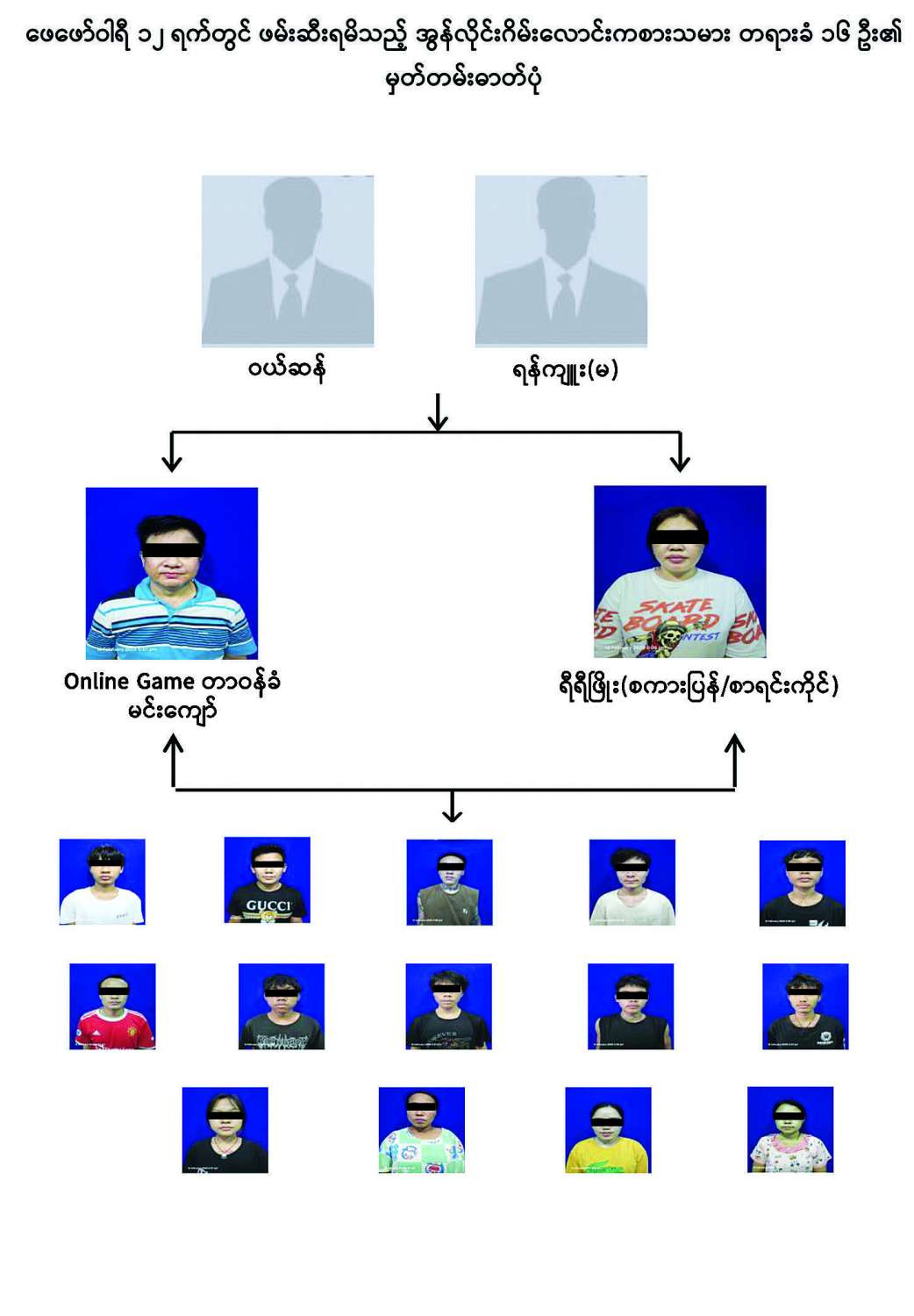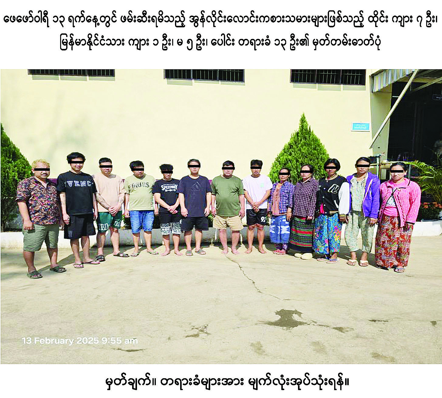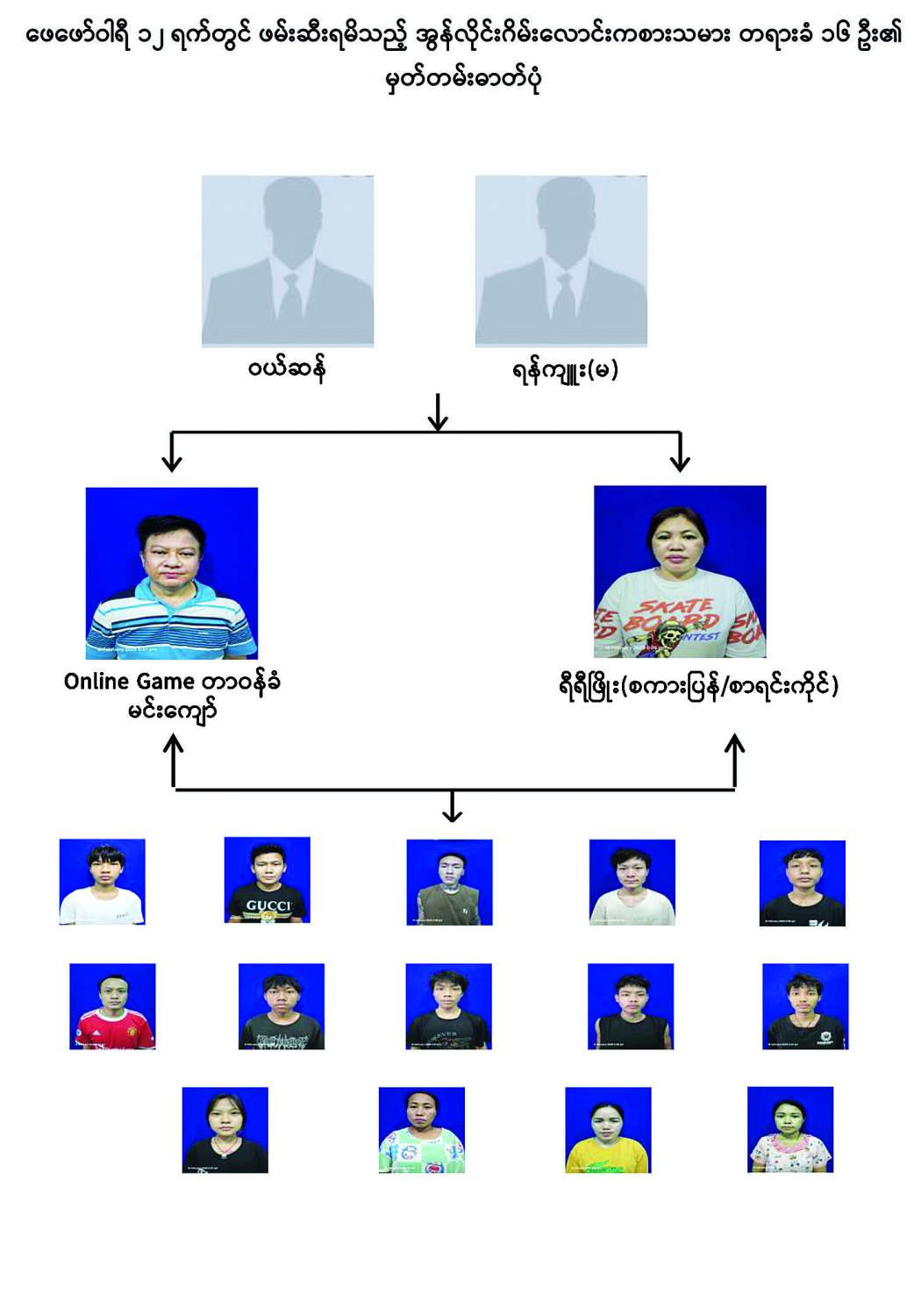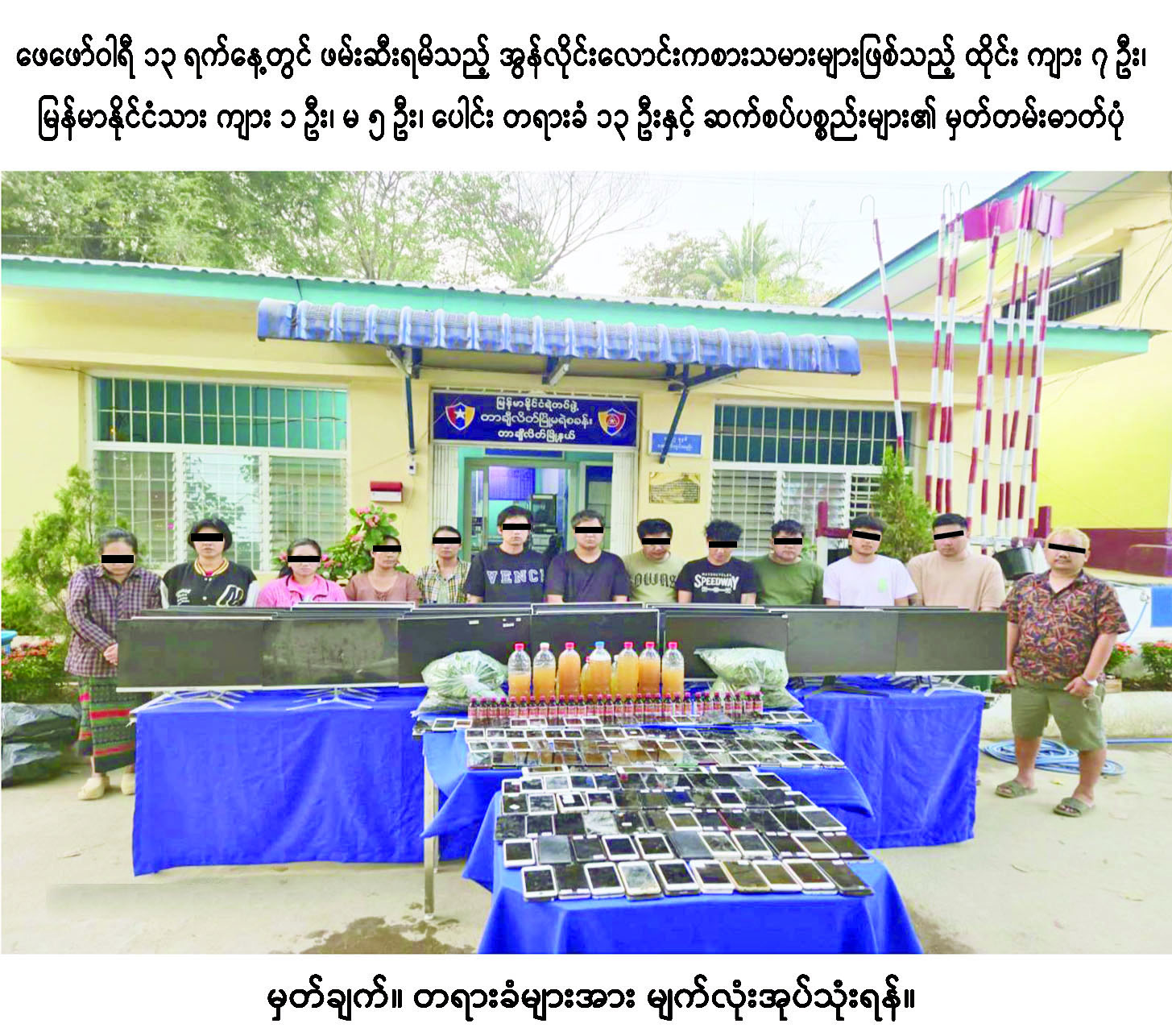 ထိုသို့ ရှာဖွေဖော်ထုတ်ဖမ်းဆီး လျက်ရှိရာရှမ်းပြည်နယ် (အရှေ့ပိုင်း) တာချီလိတ်မြို့နယ်အတွင်း တရားမဝင်အွန်လိုင်းလောင်း ကစားနှင့်ငွေကြေးလိမ်လည်မှုလုပ်ငန်းများ ဆောင်ရွက်လျက်ရှိကြောင်း သတင်းအရလုံခြုံရေး တပ်ဖွဲ့ဝင်များက ဝင်ရောက်ရှာဖွေ စစ်ဆေးခဲ့ရာ ဖေဖော်ဝါရီ ၁၂ ရက်တွင် တာချီလိတ်မြို့ ဆန်ဆိုင်း (က) ရပ်ကွက်ရှိ ထိုင်းနိုင်ငံတွင်နေထိုင်သူ ဝယ်ဆန်ငှားရမ်းထားသည့် နေအိမ်တွင် အွန်လိုင်းလောင်းကစား တာဝန်ခံ မင်းကျော်နှင့် စကားပြန်၊ စာရင်းကိုင်ရီရီဖြိုးတို့ နှစ်ဦး အပါအဝင်အမျိုးသား ၁၁ ဦးနှင့် အမျိုးသမီးငါးဦး စုစုပေါင်း ၁၆ ဦး တရား မဝင်အွန်လိုင်းလောင်းကစား ပြုလုပ်ရာ၌အသုံးပြုသည့် laptop ၆၁ လုံး၊ Flat Desktop ၃၂၉ လုံး၊ System (CPU)အလုံး ၉၀၊ ဖုန်းမျိုးစုံ အလုံး ၉၀၊ လိုင်စင်မဲ့ မော်တော်ယာဉ်နှစ်စီး၊ ဆက်စပ်ပစ္စည်းများနှင့်အတူ ဖမ်းဆီးရမိခဲ့သည်။