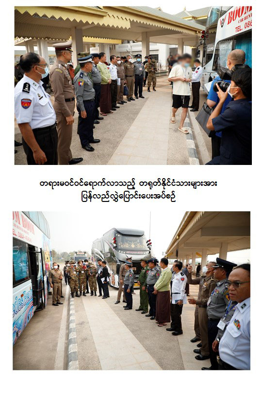 ထိုသို့ လွှဲပြောင်းပေးလျက်ရှိရာ မြန်မာနိုင်ငံအတွင်းသို့ နယ်စပ်လမ်းကြောင်းများမှတစ်ဆင့် တရားမဝင် ဝင်ရောက်နေထိုင်ပြီး ကရင်ပြည်နယ် မြဝတီမြို့-ရွှေကုက္ကိုလ်နှင့် KK Park နယ်မြေများတွင် တရားမဝင် Online လောင်းကစားမှုများ၊ Online လိမ်လည်မှုများနှင့် ဒုစရိုက်မှုများလုပ်ဆောင်ခဲ့ကြသည့် တရုတ်နိုင်ငံသား (၂၀၀) ကို လူသားချင်းစာနာထောက်ထားမှုနှင့် နိုင်ငံအချင်းချင်း ချစ်ကြည်ရင်းနှီးမှုတို့ကိုရှေးရှု၍ ယနေ့နံနက်ပိုင်းတွင် ထိုင်းနိုင်ငံမှတစ်ဆင့် သက်ဆိုင်ရာနိုင်ငံသို့ ဥပဒေလုပ်ထုံးလုပ်နည်းများနှင့်အညီ စနစ်တကျလွှဲပြောင်းပေးအပ်ခဲ့သည်။