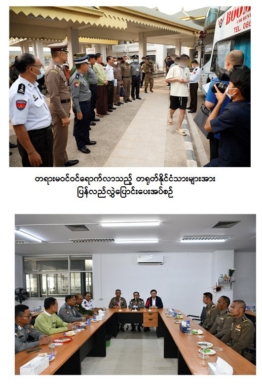 ထိုသို့ လွှဲပြောင်းပေးလျက်ရှိရာ မြန်မာနိုင်ငံအတွင်းသို့ နယ်စပ်လမ်းကြောင်းများမှတစ်ဆင့် တရားမဝင် ဝင်ရောက်နေထိုင်ပြီး ကရင်ပြည်နယ် မြဝတီမြို့-ရွှေကုက္ကိုလ်နှင့် KK Park နယ်မြေများတွင် တရားမဝင် Online လောင်းကစားမှုများ၊ Online လိမ်လည်မှုများနှင့် ဒုစရိုက်မှုများလုပ်ဆောင်ခဲ့ကြသည့် တရုတ်နိုင်ငံသား (၂၀၀) ကို လူသားချင်းစာနာ ထောက်ထားမှုနှင့် နိုင်ငံအချင်းချင်း ချစ်ကြည်ရင်းနှီးမှုတို့ကိုရှေးရှု၍ ယနေ့တွင် ထိုင်းနိုင်ငံမှတစ်ဆင့် သက်ဆိုင်ရာနိုင်ငံသို့ ဥပဒေလုပ်ထုံးလုပ်နည်းများနှင့်အညီ စနစ်တကျလွှဲပြောင်း ပေးအပ်ခဲ့သည်။