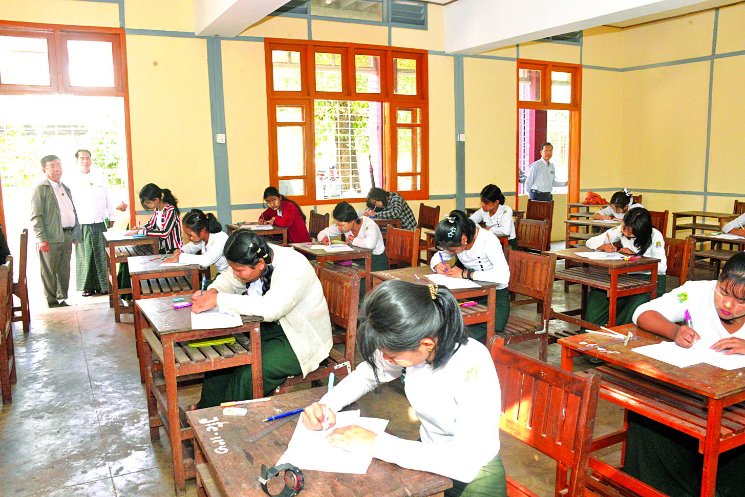 ထို့နောက် ပြည်ထောင်စု၀န်ကြီးနှင့် တာဝန်ရှိသူများသည် အမှတ် (၁) အခြေခံပညာအထက်တန်းကျောင်းနှင့် အမှတ် (၂) အခြေခံပညာအထက်တန်း ကျောင်းများတွင် ကျောင်းသားကျောင်းသူများ နှစ်ဆုံးစာမေးပွဲဖြေဆိုနေမှုများကို လှည့်လည်ကြည့်ရှုအားပေးသည်။