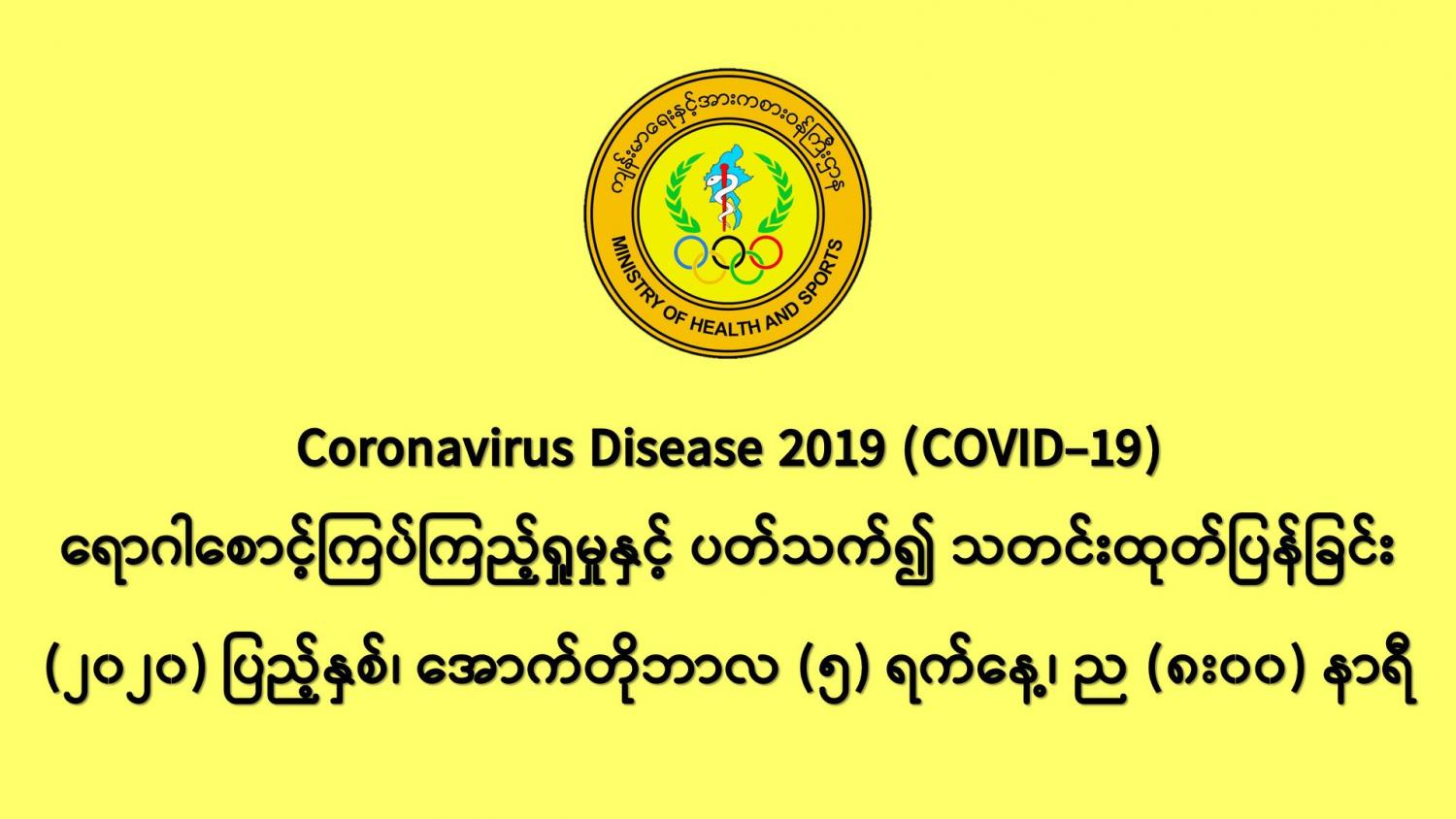 (၄-၁၀-၂၀၂၀) ရက်နေ့၊ ည (၈:၀၀)နာရီမှ (၅-၁၀-၂၀၂၀) ရက်နေ့၊ ည (၈:၀၀)နာရီ အတွင်း ဓာတ်ခွဲနမူနာ စုစုပေါင်း (၈,၂၈၅) ခုအား စစ်ဆေးပြီးစီးခဲ့ရာ COVID-19 ရောဂါ ဓာတ်ခွဲ အတည်ပြုလူနာသစ် (၉၈၇)ဦး တွေ့ရှိရပါသည်။