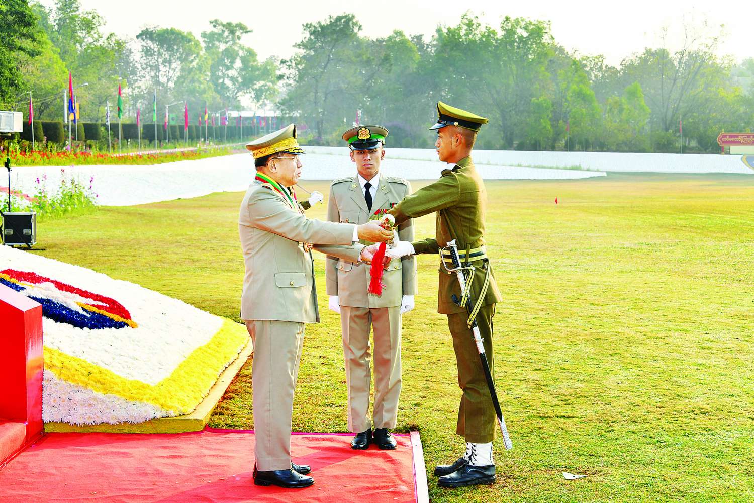 ဦးစွာ နိုင်ငံတော်စီမံအုပ်ချုပ်ရေးကောင်စီဥက္ကဋ္ဌ တပ်မတော်ကာကွယ်ရေးဦးစီးချုပ် ဗိုလ်ချုပ်မှူးကြီးသတိုးမဟာသရေစည်သူ သတိုးသီရိသုဓမ္မ မင်းအောင်လှိုင်သည် ဗိုလ်လောင်းတပ်ခွဲများ၏ အလေးပြုခြင်းကိုခံယူပြီး ဗိုလ်လောင်းတပ်ခွဲများအားလိုက်လံစစ်ဆေးသည်။ ထို့နောက် ကျောင်းဆင်းဗိုလ်လောင်းတပ်ခွဲများ၏ အနှေးလျှောက်၊ အမြန်လျှောက်ဖြင့် ချီတက်အလေးပြုခြင်းကို ခံယူသည်။