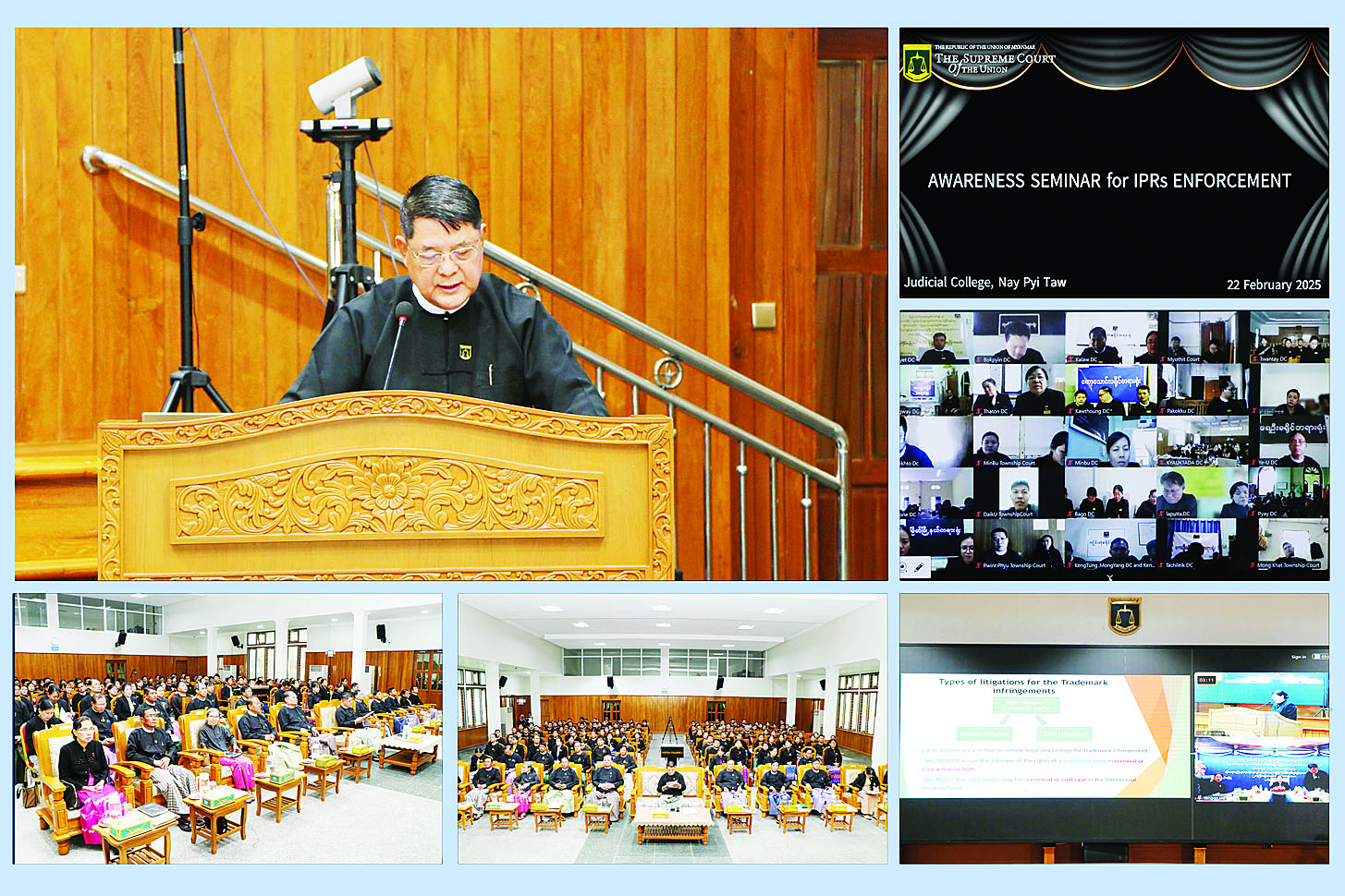 မူပိုင်ခွင့်ဆိုင်ရာဗဟိုကော်မတီ၏ အမျိုးသားအဆင့်မူပိုင်ခွင့်ဆိုင်ရာမဟာဗျူဟာ ၄.၈ အရ မူပိုင်ခွင့်မှုခင်းများအား စစ်ဆေးစီရင်မည့် တရားသူကြီးနှင့် တရားရေးအရာရှိများကို မူပိုင်ခွင့်ဆိုင်ရာ အသိပညာများဖြန့်ဝေပို့ချပေးရန်၊ မဟာဗျူဟာ ၆ အရ မူပိုင်ခွင့်ချိုးဖောက်မှုများကို တားဆီးကာကွယ်နိုင်စေခြင်းငှာ သက်ဆိုင်ရာတရားသူကြီးများကို လေ့ကျင့်သင်ကြားပေးရန်နှင့် ပြည်ထောင်စုတရားလွှတ်တော်ချုပ်၏ မဟာဗျူဟာရည်မှန်းချက် ၅.၂ ပါ မူပိုင်ခွင့်ဥပဒေများနှင့် စပ်လျဉ်းသည့် အသိပညာပေးအစီအစဉ်များဆောင်ရွက်ရန် ရည်ရွယ်၍ မူပိုင်ခွင့်ချိုးဖောက်မှုများ တားဆီးကာကွယ်ရေးဆိုင်ရာ အသိပညာပေးဆွေးနွေးပွဲ (Awareness Seminar for the Enforcement of Intellectual Property Rights)ကို ယနေ့မွန်းလွဲ ၁၂ နာရီခွဲတွင် ပြည်ထောင်စုတရားလွှတ်တော်ချုပ် Judicial College ၌ ပူးတွဲစနစ် (In-person/Virtual) ဖြင့် ကျင်းပရာ ပြည်ထောင်စုတရားသူကြီးချုပ် ဦးသာဌေး တက်ရောက်အမှာစကားပြောကြားသည်။