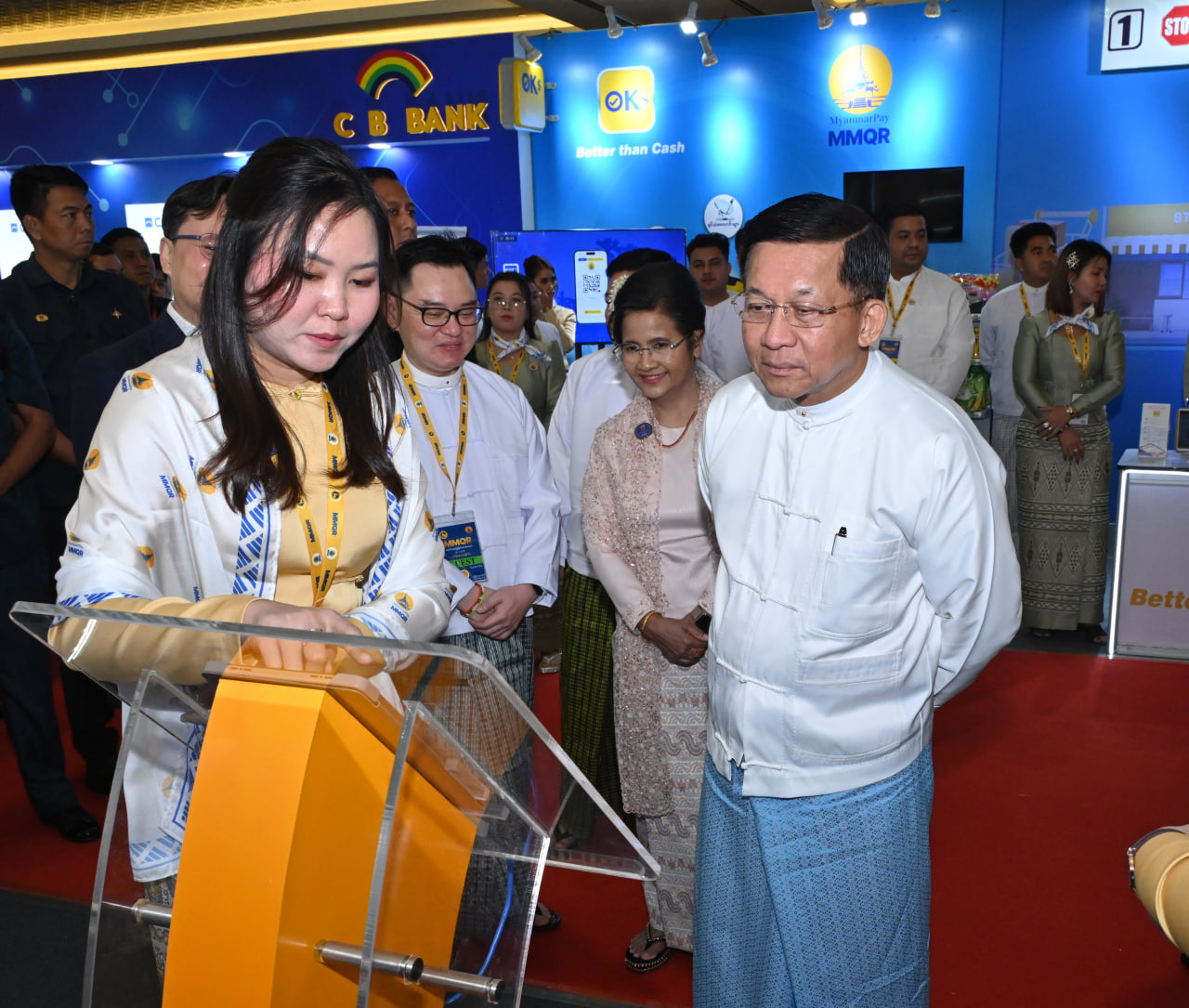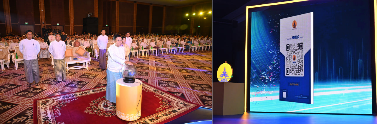 ဦးစွာ နိုင်ငံတော်စီမံအုပ်ချုပ်ရေးကောင်စီဥက္ကဋ္ဌ နိုင်ငံတော်ဝန်ကြီးချုပ်က မြန်မာနိုင်ငံ၏ ဒီဂျစ်တယ်ငွေပေးချေမှုအတွက် National QR Standard ဖြစ်သည့် MMQR စတင်အသုံးပြုခြင်းအခမ်းအနားကို စက်ခလုတ်နှိပ်၍ ဖွင့်လှစ်ပေးသည်။