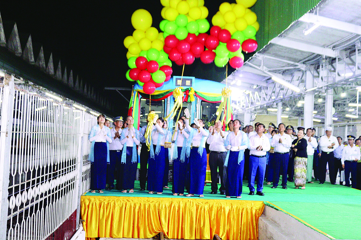 ဒုတိယဝန်ကြီးချုပ်နှင့် ပို့ဆောင်ရေးနှင့်ဆက်သွယ်ရေးဝန်ကြီးဌာန ပြည်ထောင်စုဝန်ကြီး ဗိုလ်ချုပ်ကြီး မြထွန်းဦးသည် နေပြည်တော်ကောင်စီဥက္ကဋ္ဌ ဦးသန်းထွန်းဦးနှင့် ဒုတိယဝန်ကြီးများ၊ အမြဲတမ်းအတွင်းဝန်နှင့် မြန်မာ့မီးရထားတာဝန်ရှိသူများလိုက်ပါလျက် နေပြည်တော် ဘူတာကြီးတွင် အမှတ်(၂၈)အစုန် မန္တလေး-နေပြည်တော်လေအိတ်ရထားခရီးစဉ်သစ်ဖြင့် နံနက် ၁၁ နာရီတွင် ဆိုက်ရောက်လိုက်ပါလာကြသည့် ခရီးသည်များအားလည်းကောင်း၊ အမှတ်(၇)အဆန် ရန်ကုန်-နေပြည်တော်ခေတ်မီ DEMU ရထားခရီးစဉ်သစ်ဖြင့် နံနက် ၁၁ နာရီခွဲတွင် ဆိုက်ရောက်လိုက်ပါလာကြသည့် ခရီးသည်များအားလည်းကောင်း ခင်မင်ရင်းနှီးစွာ ကြိုဆိုနှုတ်ဆက်သည်။ ဆက်လက်၍ ဒုတိယဝန်ကြီးချုပ်နှင့် ပြည်ထောင်စုဝန်ကြီးဗိုလ်ချုပ်ကြီး မြထွန်းဦးနှင့် နေပြည်တော်ကောင်စီ၊ ဥက္ကဋ္ဌ ဦးသန်းထွန်းဦးတို့သည် နေပြည်တော်ဘူတာမှ ရန်ကုန်သို့ မွန်းတည့် ၁၂ နာရီတွင် ထွက်ခွာမည့် အမှတ်(၈)အစုန် ခေတ်မီ DEMU ရထားခရီးစဉ်သစ်ဖြင့်လိုက်ပါမည့် ခရီးသည်များအားလည်းကောင်း၊ ဒုတိယဝန်ကြီး ဦးလူမွန်နှင့် ဌာနဆိုင်ရာအကြီးအကဲများသည် မွန်းတည့် ၁၂ နာရီတွင် မန္တလေးသို့ ထွက်ခွာမည့် အမှတ်(၂၇) အဆန်လေအိတ်ရထား ခရီးစဉ်သစ်ဖြင့် လိုက်ပါသွားကြမည့် ရထားစီးခရီးသည်များကိုလည်းကောင်း စားသောက်ဖွယ်ရာများ အသီးသီးပေးအပ်ပြီး ခင်မင်ရင်းနှီးစွာ ပို့ဆောင်နှုတ်ဆက်သည်။ နေပြည်တော်ဘူတာမှ ထွက်ခွာကြသည့် အမှတ်(၂၇) အဆန်လေအိတ်ရထားသည် မန္တလေးသို့ ညနေ ၅ နာရီနှင့် အမှတ် (၈) အစုန် ခေတ်မီ DEMU ရထားသည် ရန်ကုန်သို့ ညနေ ၅ နာရီခွဲတွင် အသီးသီးရောက်ရှိကြသည်။