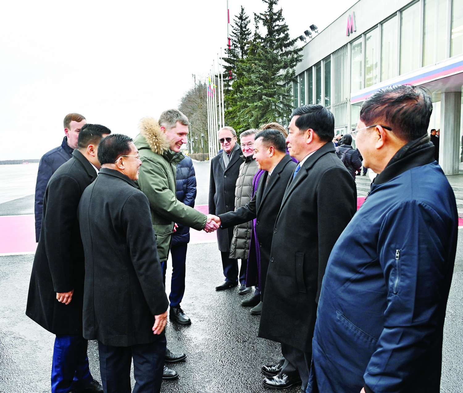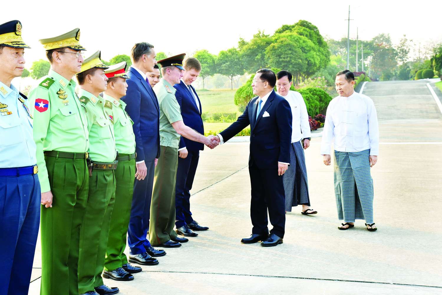နိုင်ငံတော်စီမံအုပ်ချုပ်ရေးကောင်စီဥက္ကဋ္ဌ၊ နိုင်ငံတော်ဝန်ကြီးချုပ် ဦးဆောင်သည့် မြန်မာအဆင့်မြင့်ကိုယ်စားလှယ်အဖွဲ့အား ကောင်စီဒုတိယဥက္ကဋ္ဌ၊ ဒုတိယဝန်ကြီးချုပ် ဒုတိယဗိုလ်ချုပ်မှူးကြီး စိုးဝင်း၊ ကောင်စီအတွင်းရေးမှူး၊ ကောင်စီဝင်များ၊ ပြည်ထောင်စုဝန်ကြီးများ၊ ကာကွယ်ရေးဦးစီးချုပ်ရုံး (ကြည်း) မှ တပ်မတော်အရာရှိကြီးများ၊ နေပြည်တော်တိုင်းစစ်ဌာနချုပ်တိုင်းမှူး၊ မြန်မာနိုင်ငံဆိုင်ရာ ရုရှားဖက်ဒရေးရှင်းနိုင်ငံသံရုံးမှ တာဝန်ရှိသူများက လေဆိပ်၌ ပို့ဆောင်နှုတ်ဆက်ကြသည်။