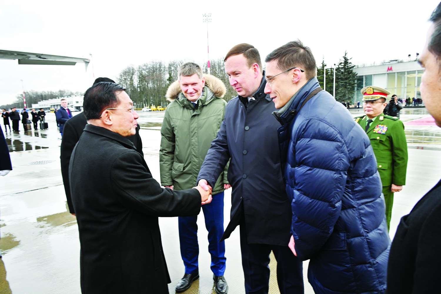 ယင်းနောက် နိုင်ငံတော်စီမံအုပ်ချုပ်ရေးကောင်စီဥက္ကဋ္ဌ၊ နိုင်ငံတော်ဝန်ကြီးချုပ် ဦးဆောင်သည့် မြန်မာအဆင့်မြင့်ကိုယ်စားလှယ်အဖွဲ့သည် ဒေသစံတော်ချိန် ညနေပိုင်းတွင် မော်စကိုမြို့ရှိ ဘနုကာဘာအပြည်ပြည်ဆိုင်ရာလေဆိပ်သို့ ရောက်ရှိကြရာ ရုရှားစီးပွားရေးဖွံ့ဖြိုးတိုးတက်မှုဝန်ကြီး Mr, Maxim Reshetnikov၊ ရုရှားနိုင်ငံခြားရေးဝန်ကြီးဌာန ဒုတိယဝန်ကြီးနှင့် တာဝန်ရှိသူများ၊ ရုရှားဖက်ဒရေးရှင်းနိုင်ငံဆိုင်ရာ မြန်မာနိုင်ငံသံအမတ်ကြီး ဦးသစ်လင်းအုန်း၊ မြန်မာနိုင်ငံဆိုင်ရာ ရုရှားဖက်ဒရေးရှင်းနိုင်ငံ သံအမတ်ကြီး H.E. Mr. Iskander Azizovi မြန်မာစစ်သံ (ကြည်း၊ ရေ၊ လေ) ဗိုလ်မှူးချုပ် မိုးကျော်တို့က ကြိုဆိုနှုတ်ဆက်ကြသည်။