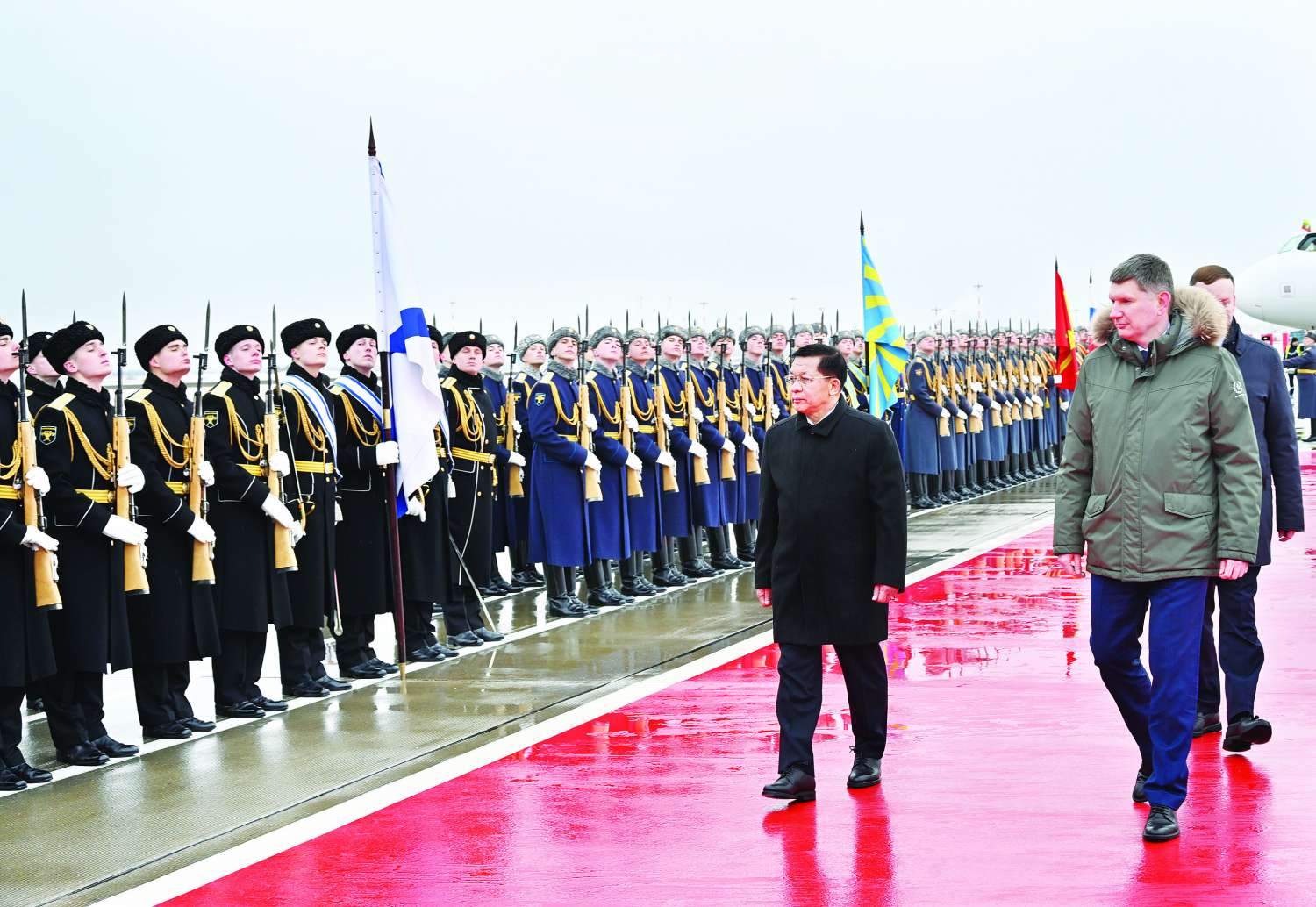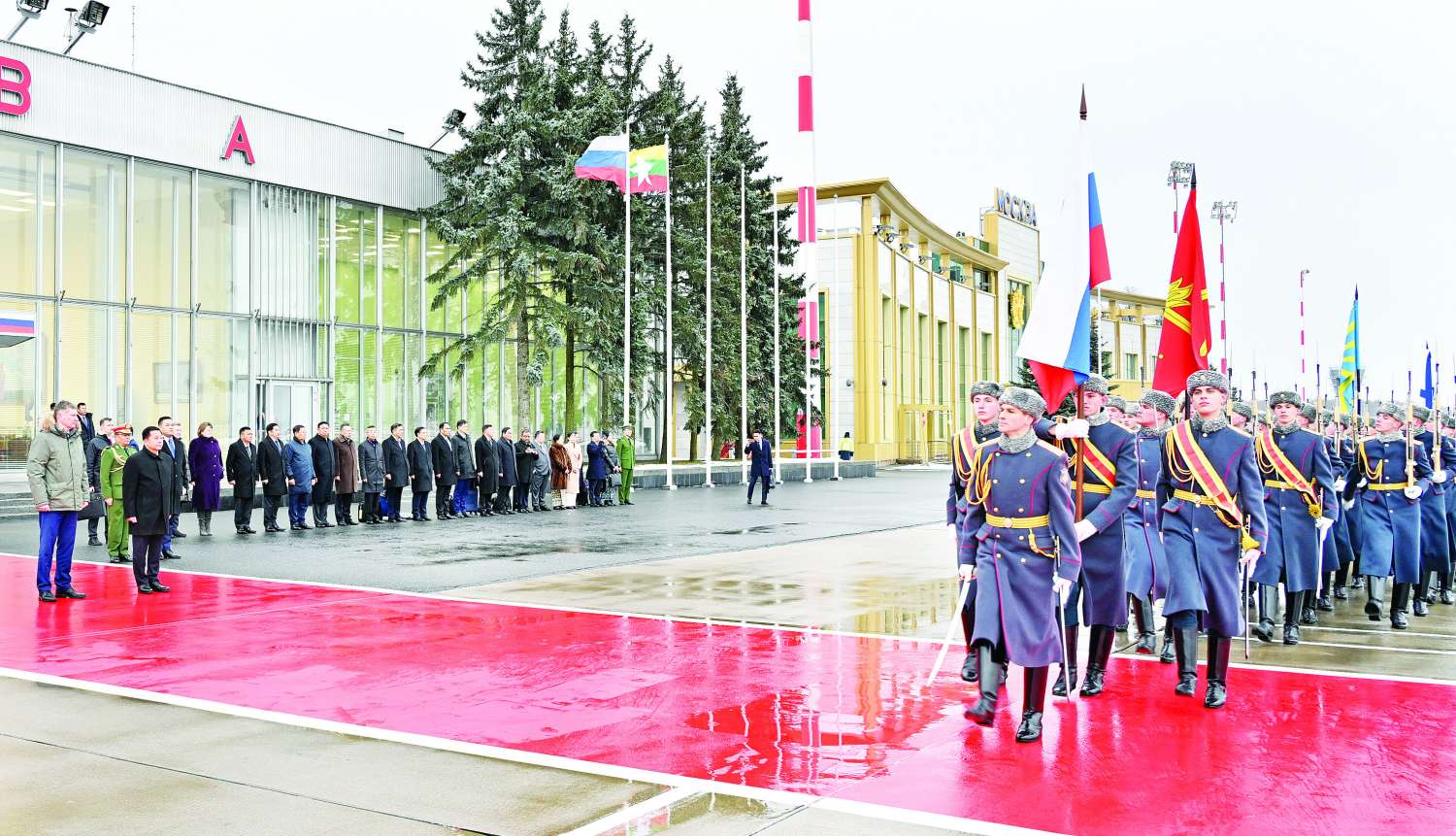 လေဆိပ်တွင် နိုင်ငံတော်စီမံအုပ်ချုပ်ရေးကောင်စီဥက္ကဋ္ဌ နိုင်ငံတော်ဝန်ကြီးချုပ် ဗိုလ်ချုပ်မှူးကြီး မင်းအောင်လှိုင်အား ရုရှားဖက်ဒရေးရှင်းနိုင်ငံ နိုင်ငံတော်ဂုဏ်ပြုတပ်ဖွဲ့က နိုင်ငံတော်အဆင့် ချစ်ကြည်ရေးခရီးစဉ် လာရောက်သည့် နိုင်ငံ့ခေါင်းဆောင်များအား ကြိုဆိုသည့်အစဉ်အလာနှင့်အညီ ဂုဏ်ပြုကြိုဆိုခဲ့သည်။ ထို့နောက် အလေးပြုခံနေရာ၌ ဂုဏ်ပြုတပ်ဖွဲ့၏ အလေးပြုခြင်းကို ခံယူသည်။ ထိုသို့ဆောင်ရွက်စဉ် ဂုဏ်ပြုတပ်ဖွဲ့က နှစ်နိုင်ငံနိုင်ငံတော်သီချင်းများအား တီးမှုတ်ဂုဏ်ပြု အလေးပြုကြသည်။ ထို့နောက် နိုင်ငံတော်စီမံအုပ်ချုပ်ရေးကောင်စီဥက္ကဋ္ဌ နိုင်ငံတော်ဝန်ကြီးချုပ် ဗိုလ်ချုပ်မှူးကြီး မင်းအောင်လှိုင်သည် ရုရှားဖက်ဒရေးရှင်းနိုင်ငံ ဂုဏ်ပြုတပ်ဖွဲ့၏ ချီတက်အလေးပြုခြင်းကို ခံယူခဲ့သည်။