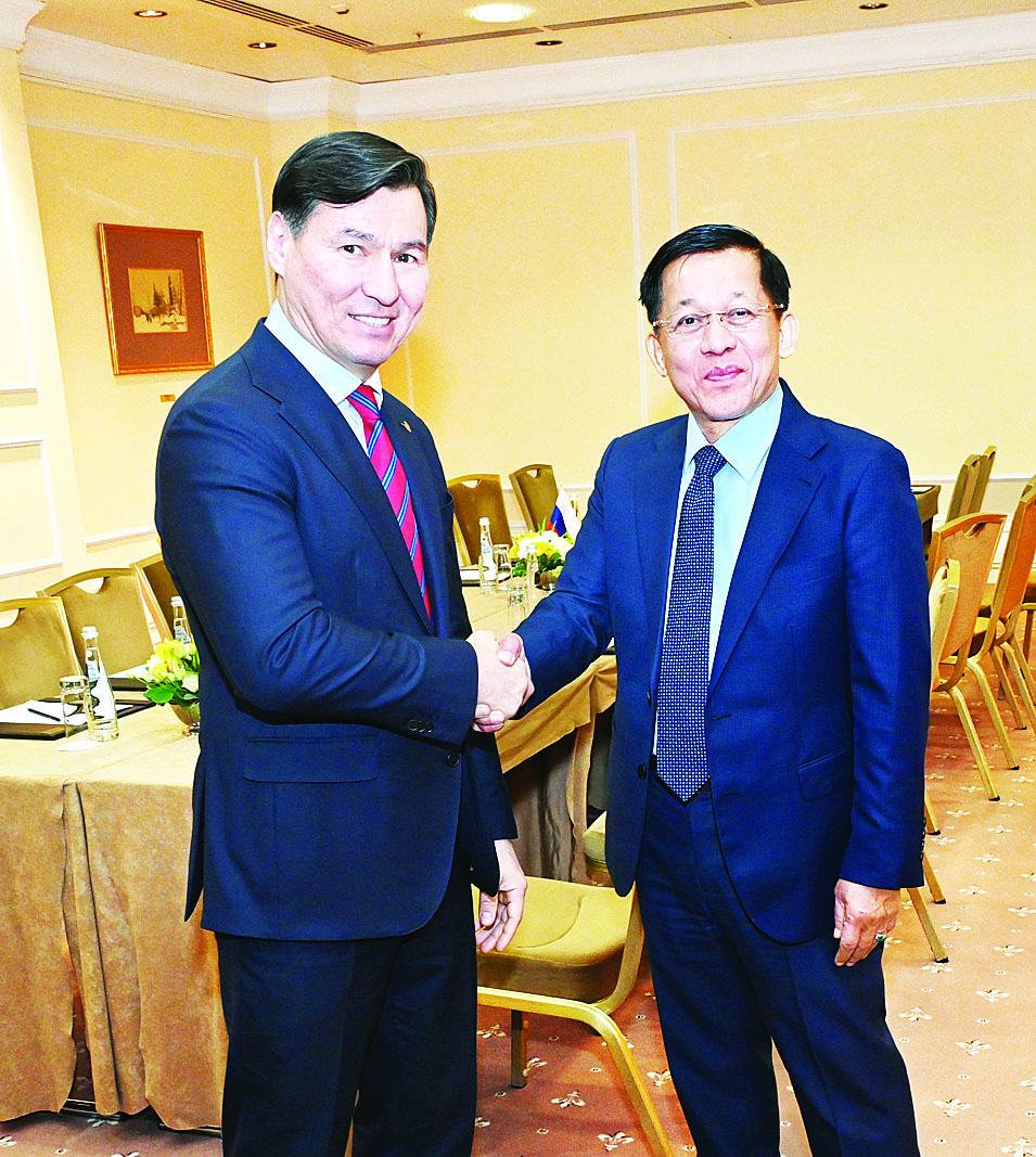ရုရှားဖက်ဒရေးရှင်းနိုင်ငံ မော်စကိုမြို့၌ တရားဝင်ချစ်ကြည်ရေးခရီးရောက်ရှိနေသည့် နိုင်ငံတော်စီမံအုပ်ချုပ်ရေးကောင်စီဥက္ကဋ္ဌ နိုင်ငံတော်ဝန်ကြီးချုပ် ဗိုလ်ချုပ်မှူးကြီးမင်းအောင်လှိုင်ထံသို့ ရုရှားဖက်ဒရေးရှင်းနိုင်ငံ ဒူးမားလွှတ်တော်ဒုတိယဥက္ကဋ္ဌ H.E. Mr.Sholban Kara-Ool သည် ယနေ့ဒေသစံတော်ချိန် မွန်းလွဲပိုင်းတွင် Radisson Collection ဟိုတယ်၌ လာရောက်ဂါရဝပြုတွေ့ဆုံသည်။
