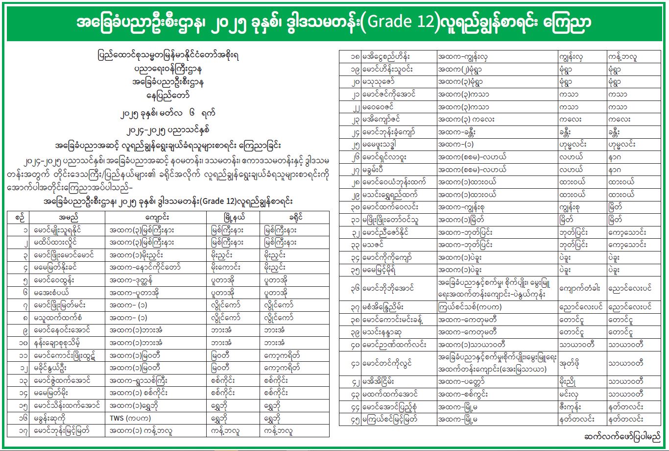 အခြေခံပညာဦးစီးဌာန၊ ၂၀၂၅ ခုနှစ်၊ ဒွါဒသမတန်း(Grade 12) လူရည်ချွန်စာရင်းကြေညာ