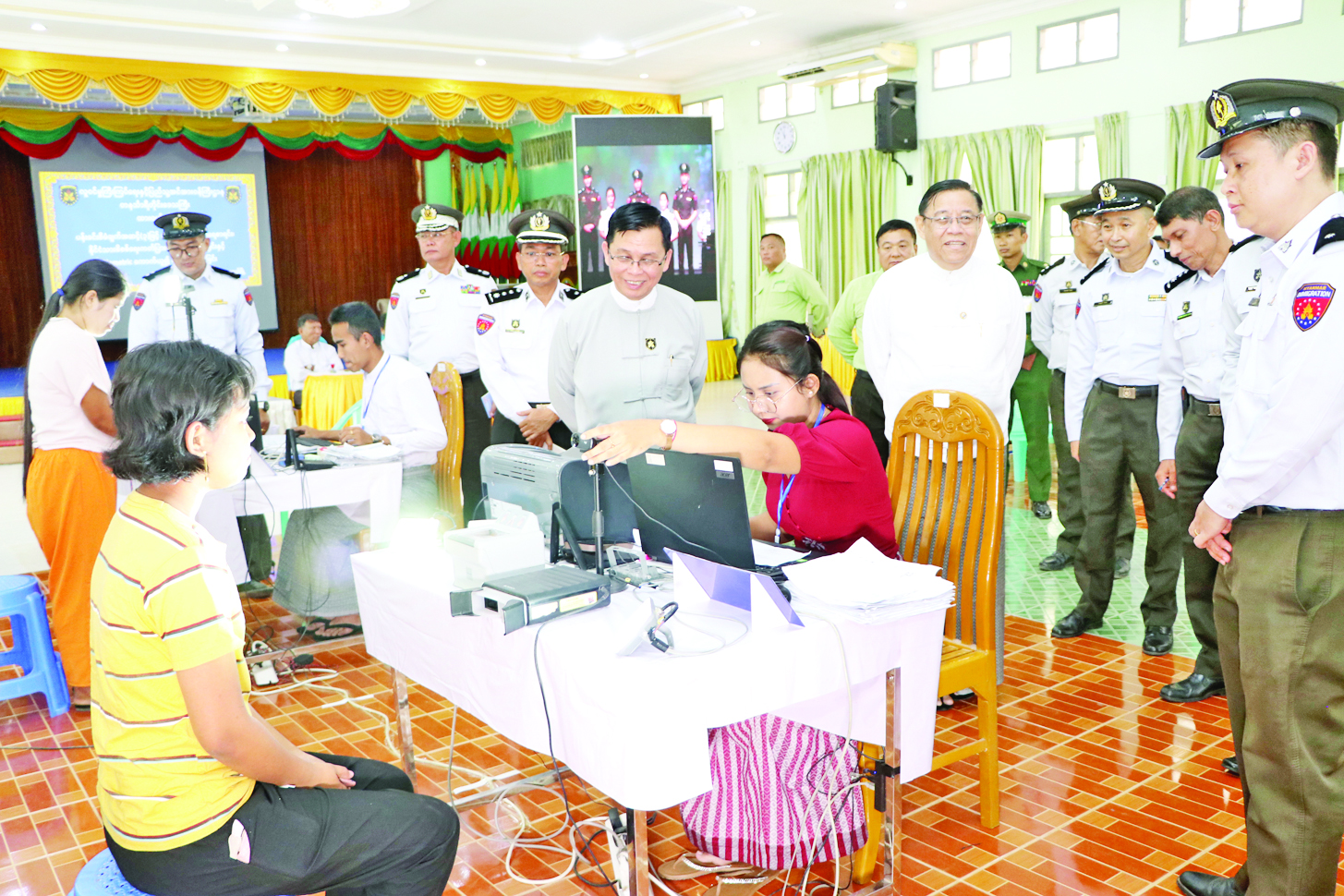 ထိုမှတစ်ဆင့် ပြည်ထောင်စုဝန်ကြီးသည် ထားဝယ်မြို့ မြို့တော်ခန်းမ၌ လူဝင်မှုကြီးကြပ်ရေးနှင့် ပြည်သူ့အင်အားဝန်ကြီးဌာန တနင်္သာရီတိုင်းဒေသကြီးမှ ဝန်ထမ်းများက ဒေသခံပြည်သူများအား ပန်းခင်းစီမံချက်အဆင့်(၃)ဖြင့် လုပ်ငန်းစဉ်အဆင့်အလိုက် နိုင်ငံသားစိစစ်ရေးကတ်ပြား စိစစ်ဆောင်ရွက်ပေးနေမှု အခြေအနေများကိုလည်းကောင်း၊ နိုင်ငံသားကတ်ပြားရရှိသူများအား e-ID စနစ်ဖြင့် ကိုယ်ရေးအချက်အလက် (Biographic) နှင့် ဇီဝဆိုင်ရာအချက်အလက် (Biometric) ကောက်ယူ၍ ဂဏန်း ၁၀ လုံးပါ Unique ID နံပါတ် ထုတ်ပေးဆောင်ရွက်နေမှုကိုလည်းကောင်း လှည့်လည်ကြည့်ရှုအားပေးကာ တာဝန်ရှိသူများအား လုပ်ငန်းလိုအပ်ချက်များ ညှိနှိုင်းဆောင်ရွက်ပေးပြီး လာရောက်ဆောင်ရွက်ကြသည့် ဒေသခံပြည်သူများအား ရင်းရင်းနှီးနှီးနှုတ်ဆက်အားပေးသည်။
