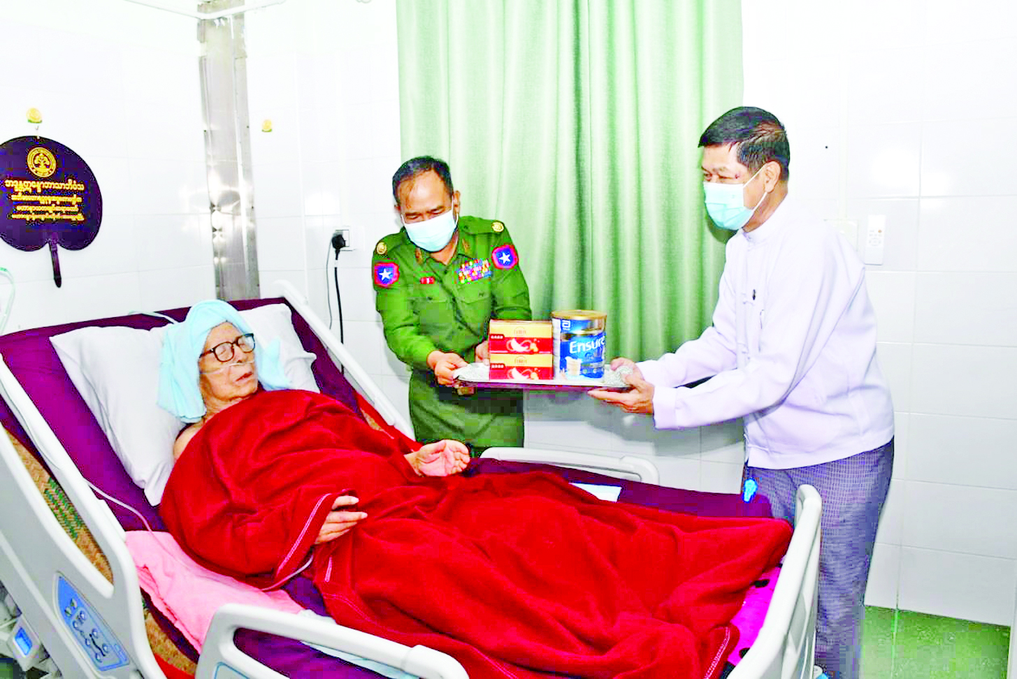 အလားတူ ကချင်ပြည်နယ် မြစ်ကြီးနားမြို့ရှိ တပ်မတော်ဆေးရုံ၊ ရှမ်းပြည်နယ် (တောင်ပိုင်း) အောင်ပန်းမြို့ရှိ တပ်မတော်ဆေးရုံ၊ တနင်္သာရီတိုင်းဒေသကြီး မြိတ်မြို့ရှိ တပ်မတော်ဆေးရုံနှင့် ရန်ကုန်တိုင်းဒေသကြီး မင်္ဂလာဒုံမြို့နယ်ရှိ တပ်မတော်အရိုးရောဂါအထူးကုဆေးရုံကြီး (ခုတင်-၅၀၀) နှင့် တပ်မတော်ဆေးရုံကြီး (ခုတင်-၁၀၀၀)၊ စစ်ကိုင်းတိုင်းဒေသကြီး ကလေးမြို့နယ်ရှိ တပ်မတော်ဆေးရုံတို့၌ တက်ရောက်ကုသမှုခံယူလျက်ရှိသော အရာရှိ၊ စစ်သည်၊ မိသားစုများ၊ စစ်မှုထမ်းဟောင်းအဖွဲ့ဝင်များ၊ မြန်မာနိုင်ငံရဲတပ်ဖွဲ့ဝင်များ၊ ပြည်သူ့စစ် (ဌာနေ) တပ်ဖွဲ့ဝင်များ၊ ဒေသခံပြည်သူများကို ယနေ့တွင် သက်ဆိုင်ရာ တိုင်းစစ်ဌာနချုပ်များမှ တိုင်းမှူးများနှင့် တာဝန်ရှိသူများက သွားရောက်ကြည့်ရှု၍ တစ်ဦးချင်း၏ ရောဂါဖြစ်ပွားမှု၊ ဆေးဝါးကုသပေးထားမှုနှင့် ကျန်းမာရေးတိုးတက်ကောင်းမွန်မှု အခြေအနေများကို မေးမြန်းအားပေးစကားပြောကြားပြီး အာဟာရဖြည့်စားသောက်ဖွယ်ရာများနှင့် ချီးမြှင့်ငွေများ ပေးအပ်သည်။