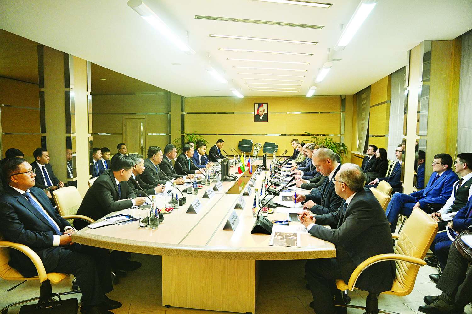 ယင်းနောက် အစည်းအဝေးခန်းမတွင် နိုင်ငံတော်စီမံအုပ်ချုပ်ရေးကောင်စီဥက္ကဋ္ဌ နိုင်ငံတော်ဝန်ကြီးချုပ်သည် ရုရှားဖက်ဒရေးရှင်းနိုင်ငံ State Space Corporation “Roscosmos” ညွှန်ကြားရေးမှူးချုပ် Mr. Dmitry Bakanov နှင့်တွေ့ဆုံ၍ နှစ်နိုင်ငံအကြား အာကာသနည်းပညာကို ငြိမ်းချမ်းစွာအသုံးချရေး ပူးပေါင်းဆောင်ရွက်သွားမည့်ကိစ္စရပ်များ၊ မြန်မာနိုင်ငံအနေဖြင့် နိုင်ငံနှင့် ပြည်သူအတွက် အကျိုးရှိမည့် ဂြိုဟ်တုလွှတ်တင်ရေးဆိုင်ရာ ကိစ္စရပ်များ၊ အာကာသနည်းပညာသင်တန်းများ တက်ရောက်နိုင်ရန်အတွက် မြန်မာနိုင်ငံမှ ပညာတော်သင်များ ပိုမိုစေလွှတ်နိုင်ရေးဆိုင်ရာကိစ္စရပ်များ၊ မြန်မာနိုင်ငံနှင့် ဆာမားရားမြို့တို့အကြား ပူးပေါင်းဆောင်ရွက်မှုနှင့် ချစ်ကြည်ရင်းနှီးမှုများတိုးတက်အောင် ဆောင်ရွက်သွားမည့် အခြေအနေများနှင့် အခြားပူးပေါင်းဆောင်ရွက်ရေးဆိုင်ရာကိစ္စရပ်များကို ရင်းနှီးပွင့်လင်းစွာ အမြင်ချင်းဖလှယ် ဆွေးနွေးကြသည်။