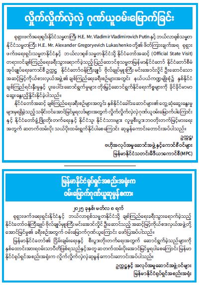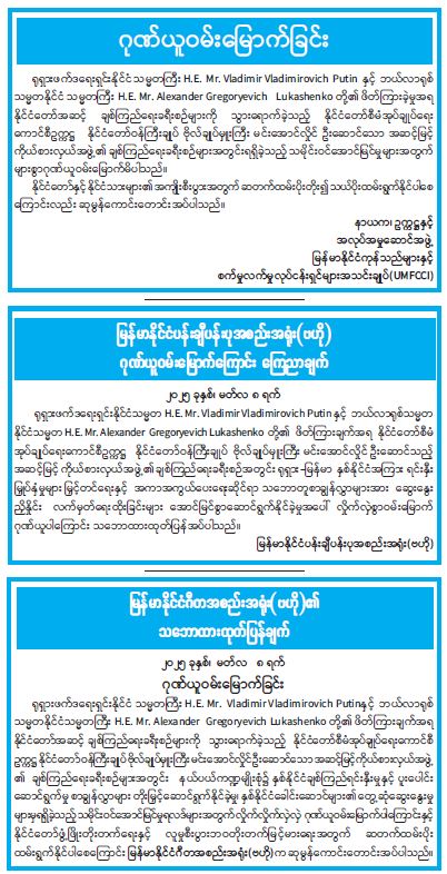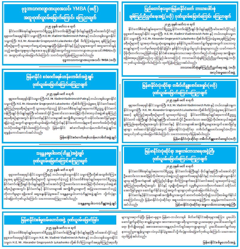 နိုင်ငံတော်စီမံအုပ်ချုပ်ရေးကောင်စီဥက္ကဋ္ဌ နိုင်ငံတော်ဝန်ကြီးချုပ် ဗိုလ်ချုပ်မှူးကြီး မင်းအောင်လှိုင်၏ ရုရှားဖက်ဒရေးရှင်းနိုင်ငံနှင့် ဘယ်လာရုစ်သမ္မတနိုင်ငံများသို့ သွားရောက်သည့် ချစ်ကြည်ရေးခရီးစဉ်များတွင် နိုင်ငံတော်အတွက် ကဏ္ဍစုံဖွံ့ဖြိုးတိုးတက်အောင် ကြိုးပမ်းဆောင်ရွက်ခဲ့မှုအပေါ် အဖွဲ့အစည်းများမှ ဂုဏ်ယူဝမ်းမြောက်ကြောင်း ထုတ်ပြန်ကြေညာ