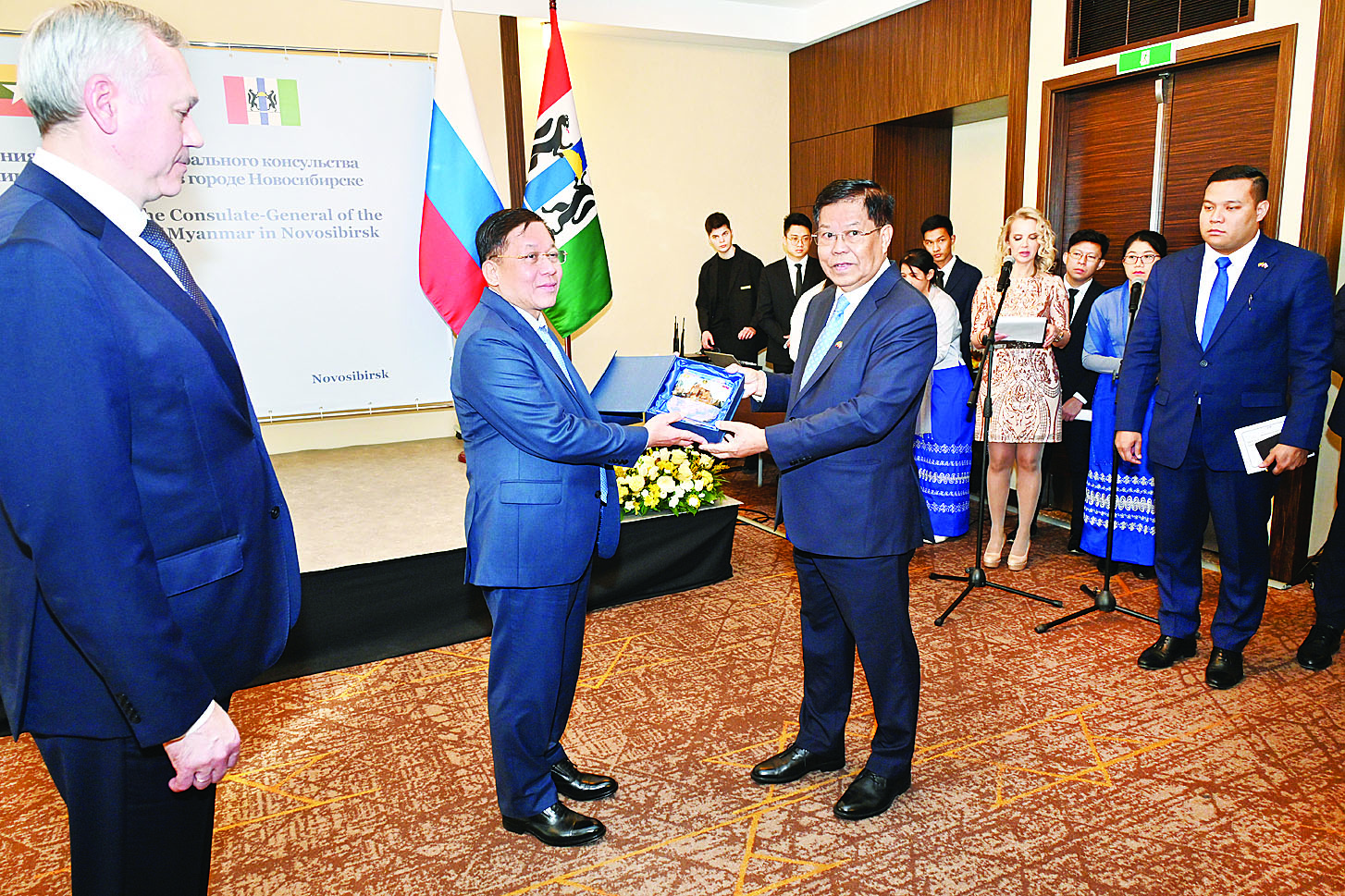 ယင်းနောက် ဒုတိယဝန်ကြီးချုပ်နှင့် နိုင်ငံခြားရေးဝန်ကြီးဌာန ပြည်ထောင်စုဝန်ကြီး ဦးသန်းဆွေက အဖွင့်နှုတ်ခွန်းဆက်စကားပြောကြားရာတွင် မြန်မာ - ရုရှားနှစ်နိုင်ငံသည် သံတမန်ဆက်ဆံရေး (၇၇) နှစ်ကြာရှိခဲ့ပြီဖြစ်ပြီး ယခုကဲ့သို့ နိုဗိုစီဗစ်မြို့တွင် မြန်မာကောင်စစ်ဝန်ချုပ်ရုံးကို ဖွင့်လှစ်နိုင်ခဲ့ခြင်းသည် နှစ်နိုင်ငံဆက်ဆံရေး၏ သမိုင်းမှတ်တိုင်တစ်ခုပင်ဖြစ်ကြောင်း၊ ရုရှားနိုင်ငံ၏ အာရှတိုက်ဘက်အခြမ်းတွင်ရှိသည့် အဓိကစီးပွားရေး၊ ကုန်သွယ်ရေး၊ သိပ္ပံနည်းပညာ၊ စက်မှုနှင့် ငွေကြေးဆိုင်ရာ ဗဟိုချက်ဖြစ်သည့် နိုဗိုစီဗစ်မြို့သည် မြန်မာနိုင်ငံနှင့် တိုက်ရိုက်လေကြောင်း ပြေးဆွဲလျက်ရှိသည့် တစ်ခုတည်းသော ရုရှားနိုင်ငံမှ မြို့တစ်မြို့ဖြစ်ကြောင်း၊ နိုဗိုစီဗစ်မြို့၊ မြန်မာကောင်စစ်ဝန်ချုပ်ရုံးအား နိုဗိုစီဗစ်ဒေသတွင် နေထိုင်ကြသည့် ရုရှားနိုင်ငံသားများအတွက် မြန်မာနိုင်ငံနှင့် ချိတ်ဆက်ပေါင်းကူးရန်၊ နှစ်နိုင်ငံအကြား နားလည်မှုမြှင့်တင်ရန်၊ နိုဗိုစီဗစ်ဒေသဝန်းကျင်ရှိ မြန်မာအသိုင်းအဝိုင်းကို ကူညီစောင့်ရှောက်ပြီး ကောင်စစ်ဆိုင်ရာ ဝန်ဆောင်မှုများ ပေးအပ်နိုင်ရန် ဖွင့်လှစ်ဆောင်ရွက်ခဲ့ခြင်းဖြစ်ကြောင်းဖြင့် ပြောကြားသည်။