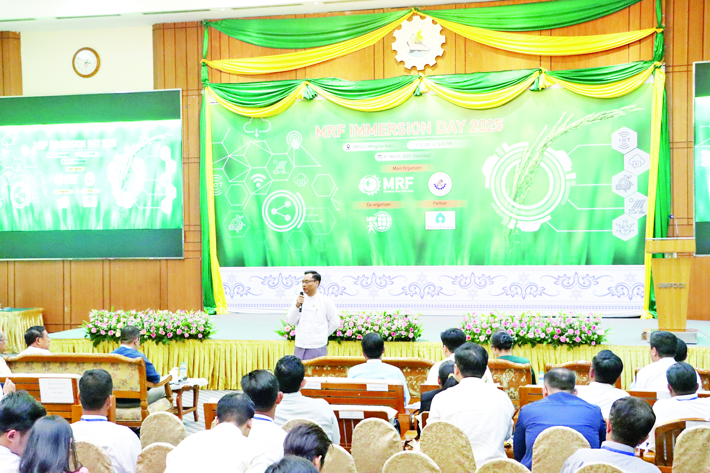 သိပ္ပံနှင့်နည်းပညာဝန်ကြီးဌာန သုတေသနနှင့် တီထွင်ဆန်းသစ်မှုဦးစီးဌာနနှင့် မြန်မာနိုင်ငံ ဆန်စပါးအသင်းချုပ် (Myanmar Rice Federation-MRF) တို့ ပူးပေါင်းကျင်းပသည့် ဆန်နှင့် ဆန်ထွက်ပစ္စည်းများ အရည်အသွေးနှင့် တိကျစွာတိုင်းတာမှုဆိုင်ရာ အသိပညာပေးဆွေးနွေးပွဲ (MRF Immersion Day 2025) အခမ်းအနားကို ယမန်နေ့က ကုန်သည်စက်မှုအသင်းချုပ် (UMFCCI)၌ ကျင်းပရာ သိပ္ပံနှင့်နည်းပညာဝန်ကြီးဌာန ဒုတိယဝန်ကြီး ဒေါက်တာအောင်ဇေယျ၊ MRF ဥက္ကဋ္ဌ၊ တာဝန်ရှိသူများ၊ မြန်မာနိုင်ငံဆန်စပါးအသင်းချုပ်နှင့် ဆက်စပ်ကုမ္ပဏီများမှ တာဝန်ရှိသူများ၊ စိုက်ပျိုးရေးပညာရှင်များ တက်ရောက်ကြသည်။