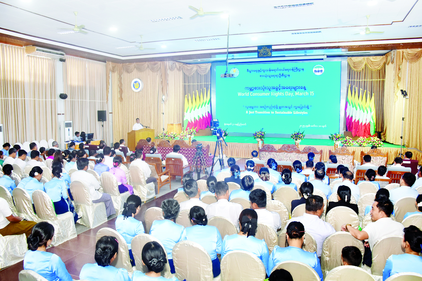 ဦးစွာ ကမ္ဘာ့စားသုံးသူအခွင့်အရေးများနေ့ (World Consumer Rights Day) အထိမ်းအမှတ်အခမ်းအနားကို ပြည်ထောင်စုဝန်ကြီး၊ ဒုတိယဝန်ကြီးများနှင့် စားသုံးသူရေးရာဦးစီးဌာန ညွှန်ကြားရေးမှူးချုပ်တို့က ဖဲကြိုးဖြတ်ဖွင့်လှစ်ပေးသည်။