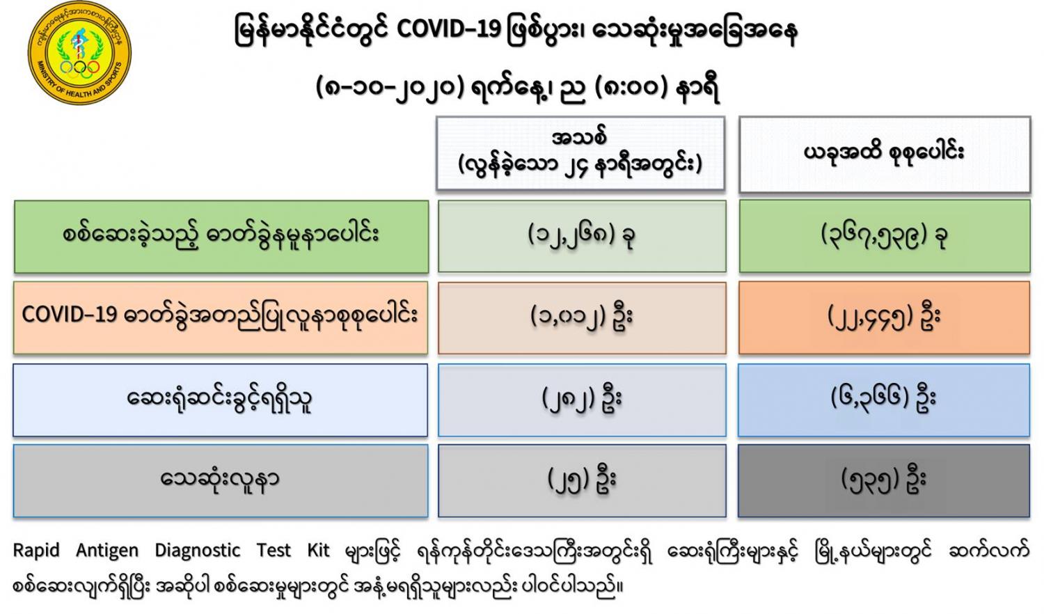 (၇-၁၀-၂၀၂၀) ရက်နေ့၊ ည (၈:၀၀)နာရီမှ (၈-၁၀-၂၀၂၀) ရက်နေ့၊ ည (၈:၀၀) နာရီ အတွင်းဓာတ်ခွဲနမူနာ စုစုပေါင်း (၁၂,၂၆၈)ခုအား စစ်ဆေးပြီးစီးခဲ့ရာ COVID-19 ရောဂါ ဓာတ်ခွဲ အတည်ပြု လူနာသစ် (၁,၀၁၂)ဦး တွေ့ရှိရပါသည်။