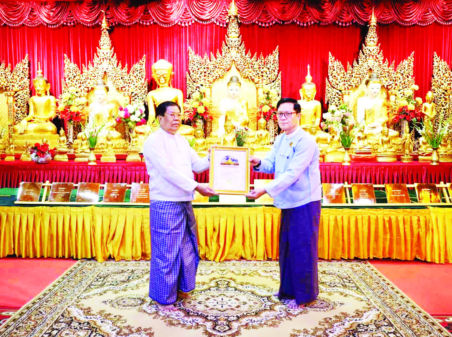 အခမ်းအနားတွင် ဒုတိယဝန်ကြီးချုပ်နှင့် ပြည်ထောင်စုဝန်ကြီးက အလှူတော်ငွေကျပ် ၆၂၅ သိန်းတန်ဖိုးရှိ ရွှေပြားသင်္ကန်းတော် ၁၅ ချပ်ကို ရွှေတိဂုံစေတီတော်ဂေါပကအဖွဲ့ထံ ပေးအပ်လှူဒါန်းရာ ဘုရားဂေါပကအဖွဲ့က ဂုဏ်ပြုမှတ်တမ်းလွှာများ ပြန်လည်ပေးအပ်သည်။