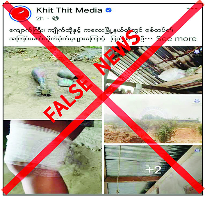 ပဲခူးတိုင်းဒေသကြီး ကျောက်ကြီးမြို့နယ်၊ မွန်ပြည်နယ်၊ ကျိုက်ထိုမြို့နယ်နှင့် စစ်ကိုင်းတိုင်းဒေသကြီး ကလေးမြို့နယ်တို့ရှိ ကျေးရွာများကို လုံခြုံရေးတပ်ဖွဲ့ဝင်များက လက်နက်ကြီးဖြင့် ပစ်ခတ်တိုက်ခိုက်ခြင်းကြောင့် ပြည်သူနှစ်ဦး ဒဏ်ရာရရှိပြီး နေအိမ်များ ပျက်စီးခဲ့ကြောင်း တရားမဝင်ပြည်ဖျက်မီဒီယာများက မဟုတ်မမှန် ရေးသားဖြန့်ဝေလျက်ရှိကြောင်း သိရှိရသည်။