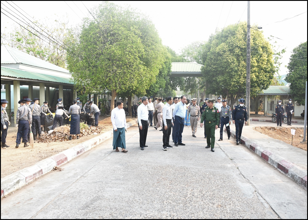ထိုသို့ ဆောင်ရွက်နေမှုများကို ပြည်ထဲရေးဝန်ကြီးဌာန ဒုတိယဝန်ကြီးဗိုလ်ချုပ် အောင်ကျော်ကျော်၊ ကျန်းမာရေးဝန်ကြီးဌာန ဒုတိယဝန်ကြီး ဒေါက်တာအေးထွန်း၊ မြန်မာနိုင်ငံရဲတပ်ဖွဲ့ ရဲချုပ်ဒုတိယရဲဗိုလ်ချုပ်ကြီး ဝင်းဇော်မိုးနှင့် တာဝန်ရှိသူများက လှည့်လည်ကြည့်ရှုအားပေးခဲ့ကြပြီး စုပေါင်းသန့်ရှင်းရေးလုပ်အားပေးဆောင်ရွက်သည့် တပ်ဖွဲ့ဝင်နှင့် ဝန်ထမ်းများကို စားသောက်ဖွယ်ရာများဖြင့် ဧည့်ခံကျွေးမွေးခဲ့ကြောင်း သတင်းရရှိသည်။