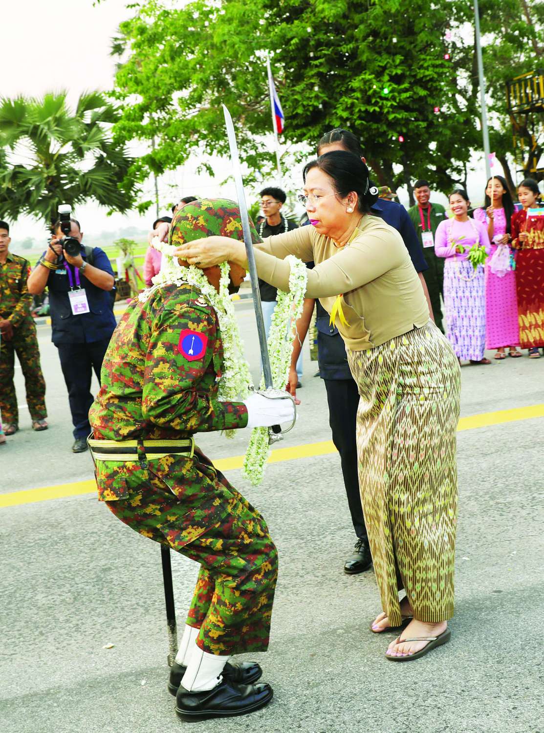 ထိုသို့ချီတက်ချိန်တွင် နိုင်ငံတော်စီမံအုပ်ချုပ်ရေးကောင်စီဥက္ကဋ္ဌ တပ်မတော် ကာကွယ်ရေးဦးစီးချုပ်၏ ဇနီး ဒေါ်ကြူကြူလှ၊ ကောင်စီဒုတိယဥက္ကဋ္ဌ ဒုတိယတပ်မတော် ကာကွယ်ရေးဦးစီးချုပ် ကာကွယ်ရေးဦးစီးချုပ်(ကြည်း)၏ဇနီး ဒေါ်သန်းသန်းနွယ်၊ ညှိနှိုင်းကွပ်ကဲရေးမှူး (ကြည်း၊ ရေ၊ လေ)၏ဇနီး၊ ကာကွယ်ရေးဦးစီးချုပ်(ရေ)၏ဇနီး၊ ကာကွယ်ရေးဦးစီးချုပ်(လေ)၏ဇနီး၊ ကာကွယ်ရေးဦးစီးချုပ်ရုံးမှ တပ်မတော်အရာရှိကြီးများ၏ ဇနီးများက ဂုဏ်ပြုပန်းကုံးများစွပ်၍ ကြိုဆိုကြသည်။ အလားတူ ကာကွယ်ရေးဦးစီးချုပ်ရုံး(ကြည်း)မှ အရာရှိ၊ စစ်သည်မိသားစုများ၊ နေပြည်တော်တိုင်းစစ်ဌာနချုပ်နှင့် တပ်နယ်အသီးသီးတို့မှ အရာရှိ၊ စစ်သည်၊ မိသားစုများ၊ မြန်မာနိုင်ငံရဲတပ်ဖွဲ့ဝင်များနှင့် မိသားစုများ၊ ဝန်ကြီးဌာနအသီးသီးမှ နိုင်ငံ့ဝန်ထမ်းများ၊ ရုပ်ရှင်ဂီတအနုပညာရှင်များ၊ ဒေသခံမိဘပြည်သူများကလည်း စစ်ကြောင်းကြီးများ ချီတက်ရာလမ်းတစ်လျှောက် သောင်းသောင်းဖြဖြကြိုဆိုကာ ဂုဏ်ပြုပန်းကုံးများစွပ်၍ ကြိုဆိုခဲ့ကြပြီး စစ်ကြောင်းကြီးများမှ တပ်မတော်သားများနှင့် မြန်မာနိုင်ငံရဲတပ်ဖွဲ့ဝင်များသည် ဇာတိသွေး၊ ဇာတိမာန်အပြည့်ဖြင့် စစ်ချီတေးများကို သံပြိုင်ဟစ်ကြွေးသီဆိုချီတက်လာကြပြီး စစ်ရေးပြကွင်းအတွင်းသို့ ရောက်ရှိနေရာယူကြသည်။