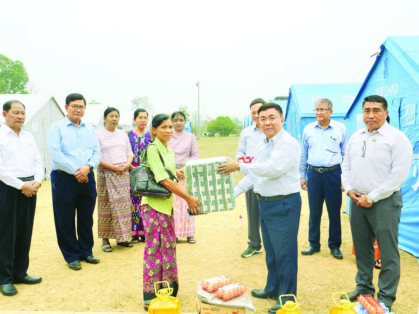 ဆက်လက်၍ ပြည်ထောင်စုဝန်ကြီးသည် ဇမ္ဗူသီရိမြို့နယ် အမှတ် (၉) အခြေခံပညာအထက်တန်းကျောင်းရှိ ယာယီငလျင်ရှောင်စခန်းသို့ သွားရောက်ကြည့်ရှုစစ်ဆေး၍ ငလျင်ဒဏ်သင့်ဝန်ထမ်းများအား စားသောက်ကုန်၊ လူသုံးကုန်နှင့် ထောက်ပံ့ငွေများကို ပေးအပ်ခဲ့သည်။