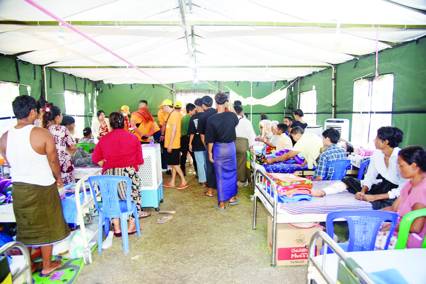 ငလျင်ဘေးဒဏ်သင့်ပြည်သူများအား ဆေးဝါးကုသပေးရန်အတွက် ရောက်ရှိနေသည့် ဘူတန်ဘုရင့်နိုင်ငံမှ ဆေးဘက်ဆိုင်ရာ အရေးပေါ်ကယ်ဆယ်ရေးအဖွဲ့သည် ပြည်ထောင်စုနယ်မြေ နေပြည်တော်၊ ပျဉ်းမနားမြို့၊ ပေါင်းလောင်းအားကစားကွင်း၌ ဖွင့်လှစ်ထားသည့် ယာယီဆေးရုံ(ပေါင်းလောင်း)၌ တပ်မတော်ဆေးဝန်ထမ်းတပ်ဖွဲ့နှင့် ကျန်းမာရေးဝန်ကြီးဌာနတို့မှ ပါရဂူကြီးများ၊ ဆရာဝန်၊ သူနာပြုများနှင့်ပူးပေါင်း၍ ငလျင်ဘေးဒဏ်သင့်ပြည်သူများအား ဆေးဝါးကုသပေးလျက်ရှိသည်။