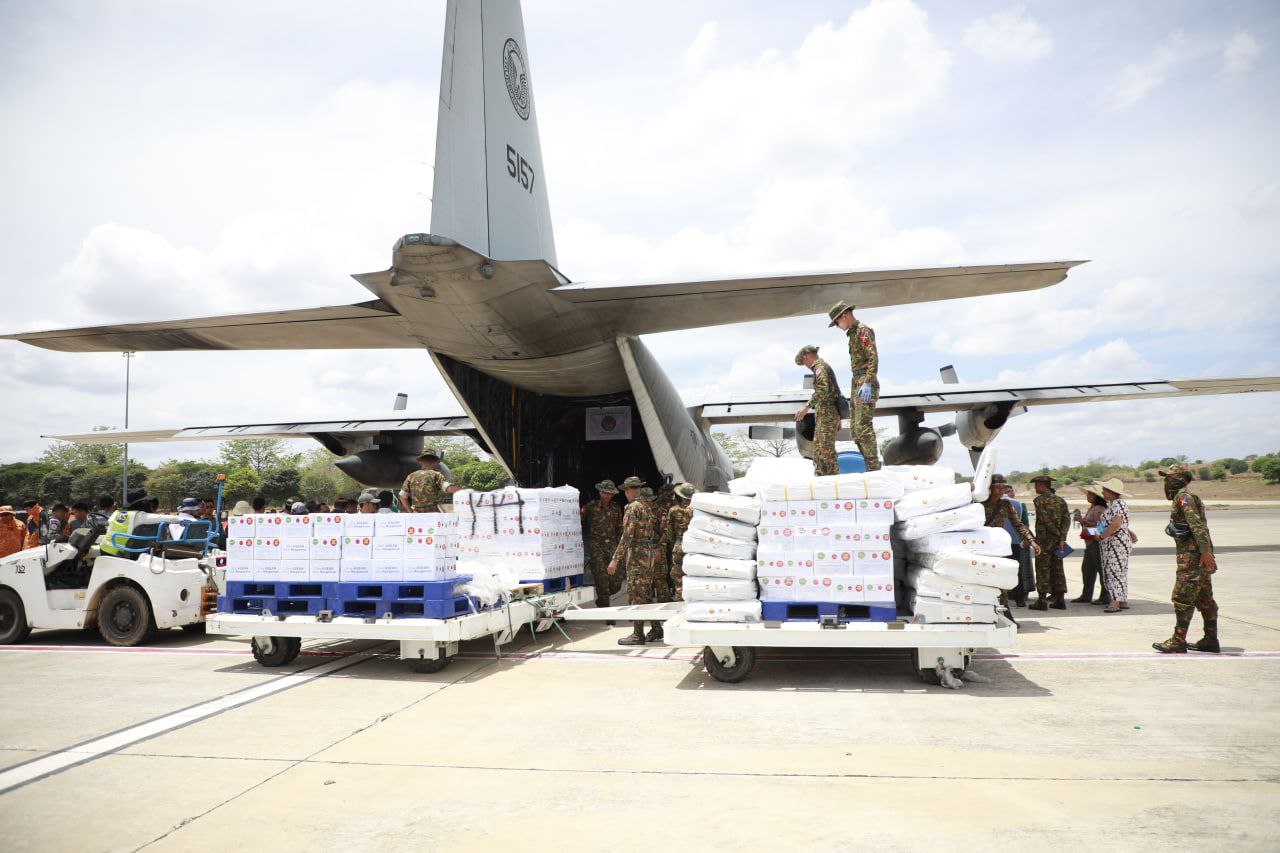ASEAN AHA Centre မှ လှူဒါန်းသော လူသားချင်းစာနာထောက်ထားမှုဆိုင်ရာ အကူအညီပစ္စည်းများနှင့် လူသုံးကုန်ပစ္စည်းများ၊ စုစုပေါင်းပစ္စည်းတန်ချိန် ၅၀၁၃ ကီလိုဂရမ်အား ဖိလစ်ပိုင်နိုင်ငံမှ C-130 လေယာဉ်ဖြင့်တင်ဆောင်၍ ယနေ့နံနက် ၁၀ နာရီ ၁၆ မိနစ်အချိန်တွင်လည်းကောင်း၊ လူသားချင်းစာနာထောက်ထားမှုဆိုင်ရာ အကူအညီပစ္စည်း ၄၃၁၈ ကီလိုဂရမ်အား ဖိလစ်ပိုင်နိုင်ငံမှ C-130 လေယာဉ်ဖြင့်တင်ဆောင်၍ ယနေ့နံနက် ၁၁ နာရီ ၁၅ မိနစ်တွင်လည်းကောင်း၊ ကုန်တန်ချိန် ၁၄၆၉၁ ကီလိုဂရမ်အား မလေးရှားနိုင်ငံ MAI လေကြောင်းလိုင်းဖြင့်တင်ဆောင်၍ မွန်းလွဲ ၁ နာရီ ၁၃ မိနစ်တွင် နေပြည်တော်ရှိ တပ်မတော်လေဆိပ်သို့ အသီးသီးရောက်ရှိလာကြသည်။