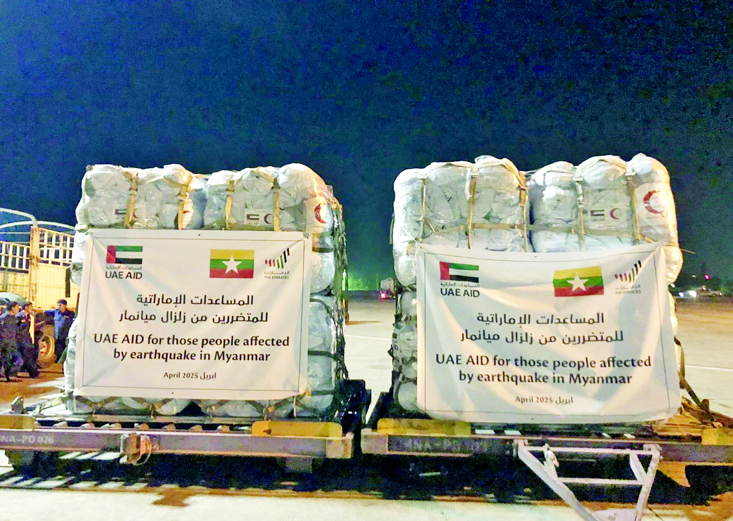 မတ် ၃၀ ရက်မှ ဧပြီ ၁၃ ရက်အထိ ငလျင်ဘေးသင့်ပြည်သူများအတွက် အိန္ဒိယနိုင်ငံ AHA Center ၊ တရုတ်ပြည်သူ့သမ္မတနိုင်ငံ၊ ဗီယက်နမ်နိုင်ငံ၊ ဘင်္ဂလားဒေ့ရှ်နိုင်ငံ၊ ထိုင်းနိုင်ငံ၊ အင်ဒိုနီးရှားနိုင်ငံ၊ ပါကစ္စတန်နိုင်ငံ၊ ရုရှား ဖက်ဒရေးရှင်းနိုင်ငံ၊ ဘယ်လာရုဇ်နိုင်ငံ၊ လာအိုနိုင်ငံ၊ Singapore Red Cross Society၊ နီပေါနိုင်ငံ၊ UAE နှင့် ဘရူနိုင်းနိုင်ငံတို့မှ ပေးပို့လှူဒါန်း သည့်ပစ္စည်းများကို ငလျင်ဘေးသင့်ဒေသများသို့ အချိန်မဆိုင်းဘဲ ဆက်လက်ဖြန့်ခွဲဆောင်ရွက်လျက်ရှိသည်။ နိုင်ငံတကာက ကူညီထောက်ပံ့သည့်ပစ္စည်းများမှာ မိုးကာတဲ၊ တာပေါ်လင်၊ Hygiene Kit ၊ Kitchen Set၊ မီးစက်၊ Sleeping Bags၊ စားသောက်ကုန်ပစ္စည်း၊ လူသုံးကုန်ပစ္စည်း၊ အိမ်သုံးကုန်ပစ္စည်း၊ လျှပ်စစ်ပစ္စည်း၊ ဆေးနှင့်ဆေးပစ္စည်း၊ ခွဲစိတ်ခန်းသုံးပစ္စည်းတို့ဖြစ်သည်။
