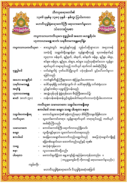 သီတဂူဆရာတော် နိုင်ငံတော်ဩဝါဒါစရိယ ရွှေကျင်နိကာယသာသနာပိုင် အဘိဓဇမဟာရဋ္ဌဂုရု၊ အဘိဓဇအဂ္ဂမဟာ သဒ္ဓမ္မဇောတိက၊ အဂ္ဂမဟာပဏ္ဍိတ၊ သီတဂူဆေးရုံတော်များနှင့် သီတဂူဗုဒ္ဓတက္ကသိုလ်များ၏ အဓိပတိသီတဂူဆရာတော်၏ ၁၃၈၆ ခုနှစ်မှ ၁၃၈၇ ခုနှစ် - နှစ်ကူး ဩဝါဒကထာ မဟာဝိသုဒ္ဓါရုံဆရာတော်ကြီး ရေးသားတော်မူသော သံဝေဂဆုံးမစာ