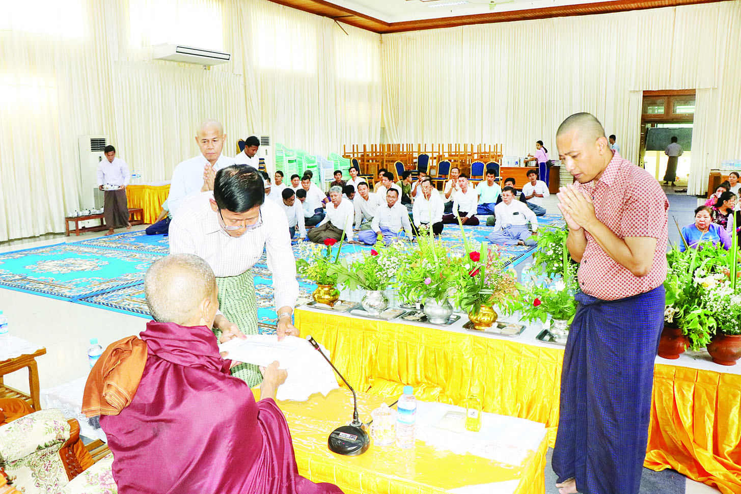 ယင်းနောက် ဒုတိယဝန်ကြီး၊ အမြဲတမ်းအတွင်းဝန်နှင့် ညွှန်ကြားရေးမှူးချုပ်တို့က ဆရာတော် သံဃာတော်အရှင်သူမြတ်တို့ထံ ဆွမ်းဆန်တော်၊ ဆီ၊ သင်္ကန်းနှင့်တကွ ဒါတဗ္ဗဝတ္ထုအစုစုတို့အား ဆပ်ကပ်လှူဒါန်းကြပြီး ဆရာတော် ဦးတေဇောဘာသထံမှ အနုမောဒနာတရားနာကြား၍ ကုသိုလ်ကောင်းမှု အစုစုတို့အတွက် ရေစက်သွန်းချအမျှပေးဝေခဲ့ကြသည်။ ထို့နောက် ဗုဒ္ဓသာသနံစိရံတိဋ္ဌတုသုံးကြိမ်ရွတ်ဆိုဆုတောင်း၍ အခမ်းအနားကို ရုပ်သိမ်းသည်။