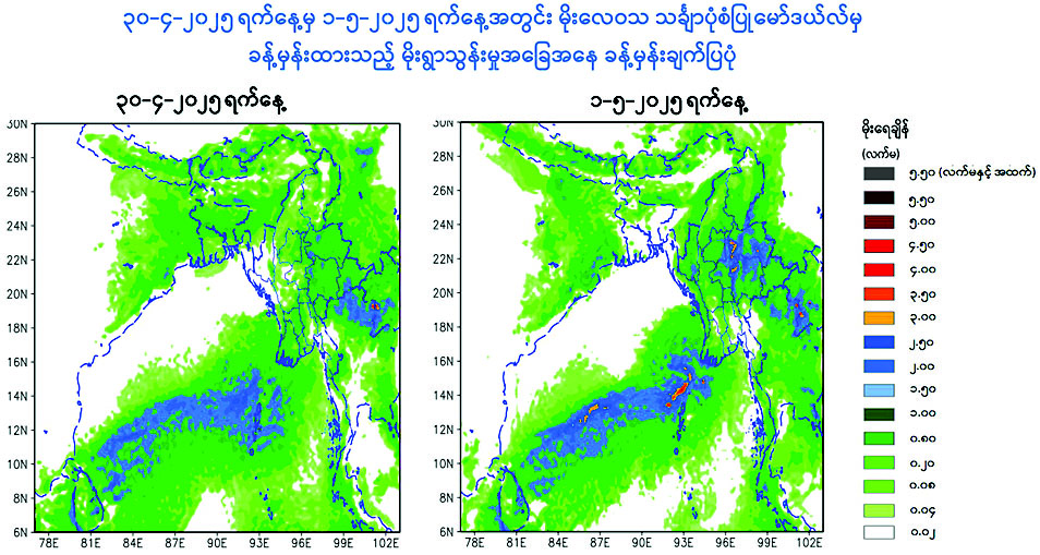 ယနေ့ညနေ ၅ နာရီခွဲအချိန် တိုင်းထွာချက်များအရ အနောက်ဘက်မှ ရွေ့လျားလာသော လေပွေလှိုင်းများ၏ အရှိန်ကြောင့်လည်းကောင်း၊ အရှေ့ဘက်မှ ရွေ့လျားလာသော လေပွေလှိုင်းများ၏ အရှိန်ကြောင့်လည်းကောင်း၊ ကပ္ပလီပင်လယ်ပြင်နှင့်ဘင်္ဂလားပင်လယ်အော်တို့မှ လေနွေးများနှင့် တရုတ်ပြည်မကြီးပေါ်ရှိ လေဖိအားကြီးရပ်ဝန်းဒေသမှ ရွေ့လျားလာသော လေအေးများတွေ့ဆုံမှုကြောင့် လည်းကောင်း ဧပြီ ၂၈ ရက်မှ မေ ၃ ရက်အတွင်း နေပြည်တော်၊ ရန်ကုန်တိုင်းဒေသကြီး၊ မန္တလေးတိုင်းဒေသကြီး၊ ပဲခူးတိုင်းဒေသကြီး၊ မကွေးတိုင်းဒေသကြီး၊ စစ်ကိုင်းတိုင်းဒေသကြီး၊ ဧရာဝတီတိုင်းဒေသကြီး၊ တနင်္သာရီတိုင်းဒေသကြီး၊ ကချင်ပြည်နယ်၊ ကယားပြည်နယ်၊ ကရင်ပြည်နယ်၊ ချင်းပြည်နယ်၊ မွန်ပြည်နယ်၊ ရခိုင်ပြည်နယ်နှင့် ရှမ်းပြည်နယ်တို့တွင် နေရာကျဲကျဲမှ နေရာစိပ်စိပ် မိုးထစ်ချုန်းရွာပြီး အချို့ဒေသများတွင် နေရာကွက်၍ မိုးကြီးနိုင်သည်။