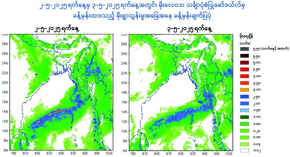 သို့ဖြစ်ပါ၍ ပြည်သူများ အနေဖြင့် အချိန်အခါမဟုတ် မိုးရွာခြင်းနှင့်အတူ လေပြင်းများတိုက်ခတ်ခြင်း၊ မိုးထစ်ချုန်းခြင်း၊ မိုးကြိုးပစ်ခြင်း၊ လျှပ်စီးလက်ခြင်း၊ မိုးသီးကြွေခြင်းနှင့် မြေပြိုခြင်းစသည့် မိုးလေဝသ ဖြစ်စဉ်များ ဖြစ်ပေါ်နိုင်ပါသဖြင့် ကြိုတင်သတိပြုနိုင်ပါရန် အကြံပြုအပ်ပါသည်။