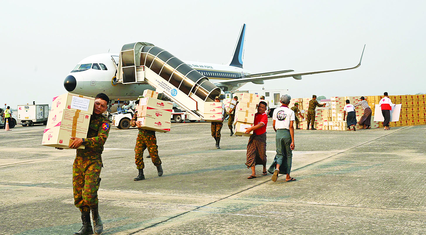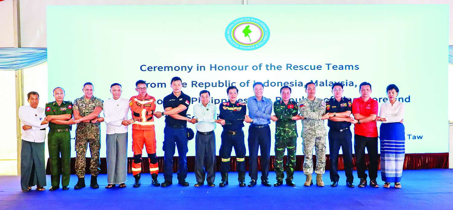 မြန်မာနိုင်ငံအတွင်းရှိ ငလျင်ဘေးဒဏ်သင့်ဒေသများသို့ ကူညီကယ်ဆယ်ရေးလုပ်ငန်းများ ဆောင်ရွက်ပေးရန်အတွက် ရုရှား၊ တရုတ်၊ အိန္ဒိယ၊ ထိုင်း၊ စင်ကာပူ၊ မလေးရှား၊ ဘင်္ဂလား ဒေ့ရှ်၊ ဗီယက်နမ်၊ ယူအေအီး၊ လာအို၊ ဘယ်လာရုစ်၊ အင်ဒိုနီးရှား၊ ဘူတန်၊ ဖိလစ်ပိုင်၊ ဂျပန်၊ နီပေါ၊ ပါကစ္စတန်၊ တူကီယဲ၊ အမေရိကန်၊ သီရိလင်္ကာ၊ ဩစတြေးလျ၊ အဇာဘိုင်ဂျန်၊ ဘရူနိုင်း၊ တောင်ကိုရီးယား၊ ဂျာမနီနှင့် ကမ္ဘောဒီးယားစသည့် နိုင်ငံပေါင်း ၂၆ နိုင်ငံတို့မှ လူသားချင်းစာနာထောက်ထားမှု အကူ အညီပစ္စည်းများ ထောက်ပံ့ပေးခြင်း၊ ရှာဖွေကယ်ဆယ်ရေး လုပ်ငန်းများ ဆောင်ရွက်ရန်အတွက် ရုရှား၊ တရုတ်၊ အိန္ဒိယ၊ ထိုင်း၊ စင်ကာပူ၊ မလေးရှား၊ ဘင်္ဂလားဒေ့ရှ်၊ ဗီယက်နမ်၊ ယူအေအီး၊ ဘယ်လာရုစ်၊ အင်ဒိုနီးရှား၊ ဖိလစ်ပိုင်နှင့် တူကီယဲစသည့် နိုင်ငံ ၁၃ နိုင်ငံတို့မှ ဆေးအကာအကွယ်အဖွဲ့များ ပူးတွဲပါဝင်သည့် ရှာဖွေကယ်ဆယ်ရေးအဖွဲ့ ၁၆ ဖွဲ့ လူဦးရေ ၁၀၇၀ နှင့် ရှာဖွေကယ်ဆယ်ရေး ခွေး ၃၈ ကောင်တို့ဖြင့် ပြည်တွင်းရှိ အဖွဲ့အစည်းများနှင့် ပူးပေါင်းကာ မြေပြင်ကွင်းဆင်း၍ ငလျင် ဒဏ်ကြောင့် ပြိုကျပျက်စီးခဲ့သည့် အဆောက်အဦများအတွင်းသို့ ရောက်ရှိပိတ်မိနေကြသည့် ပြည်သူများအား နိုင်ငံအလိုက် ရှာဖွေကယ်ဆယ်ရေးလုပ်ငန်းများကို သက်စွန့်ကြိုးပမ်းဆောင်ရွက်ခဲ့ကြပြီး ကယ်ဆယ်ရှာဖွေတွေ့ရှိခဲ့သည့် လူနာများအား လိုအပ်သည့် ကျန်းမာရေးစောင့်ရှောက်မှုလုပ်ငန်းများကိုလည်း ကယ်ဆယ်သည့်နေရာတွင်ပင် အမြန်ဆုံးဆောင်ရွက်ပေးနိုင်ခဲ့ပါသည်။