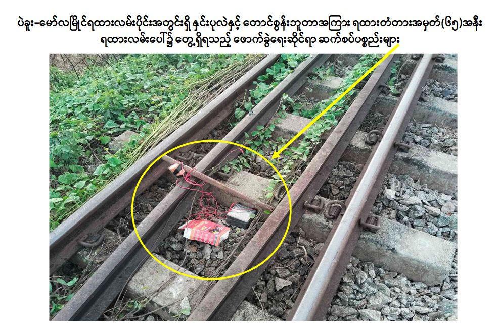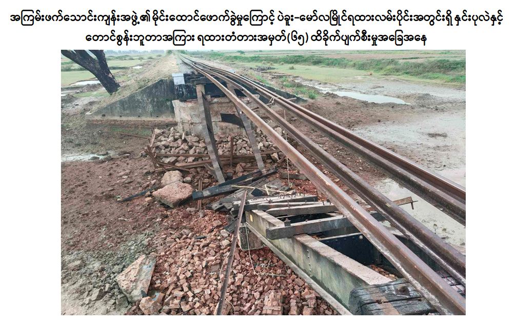 အကြမ်းဖက်သောင်းကျန်းသူအဖွဲ့များအနေဖြင့် ၂၀၂၁ ခုနှစ်၊ ဖေဖော်ဝါရီလမှစ၍ ယခုအချိန်အထိ မြန်မာ့မီးရထားလမ်းကွန်ရက်တစ်ခုလုံးတွင် ရထားလမ်းနှင့် ရထားဘူတာနယ်မြေအတွင်း မိုင်းထောင်ဖောက်ခွဲဖျက်ဆီးခြင်း(၈၁)ကြိမ်၊ ရထားတံတား/ သံလမ်းများအား မိုင်းထောင်ဖောက်ခွဲဖျက်ဆီးခြင်း(၁၇၆)ကြိမ်၊ ဘူတာအဆောက်အဦနှင့် ဝန်ထမ်းနေအိမ်များအား မီးရှို့ဖျက်ဆီးခြင်း(၁၆)ကြိမ် ကျူးလွန်ခဲ့ကြသည်။