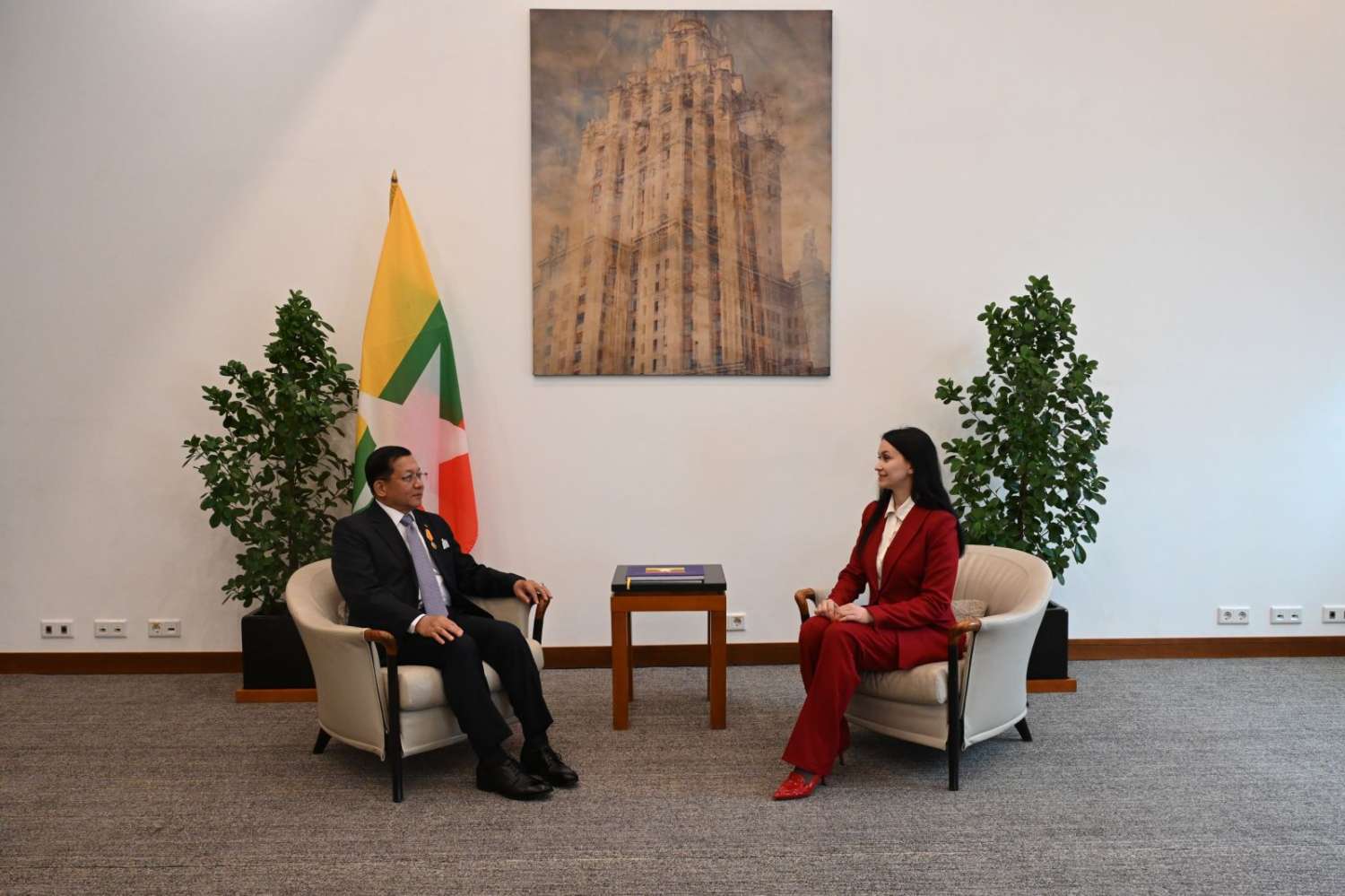 ရုရှားဖက်ဒရေးရှင်းနိုင်ငံတွင်ရောက်ရှိနေသည့် နိုင်ငံတော်စီမံအုပ်ချုပ်ရေးကောင်စီဥက္ကဋ္ဌ နိုင်ငံတော်ဝန်ကြီးချုပ် ဗိုလ်ချုပ်မှူးကြီး မင်းအောင်လှိုင်သည် ယနေ့ဒေသစံတော်ချိန် နံနက်ပိုင်းတွင် ရုရှားဖက်ဒရေးရှင်းနိုင်ငံ၊ RT TV Channel နှင့် Krasnaya Zvezda သတင်းစာတို့၏ တွေ့ဆုံမေးမြန်းမှုများအား မော်စကိုမြို့၊ Ararat Park ဟိုတယ်ခန်းမ၌ သီးခြားစီလက်ခံတွေ့ဆုံ၍ သိရှိလိုသည့် မေးမြန်းမှုများကို ဖြေကြားသည်။