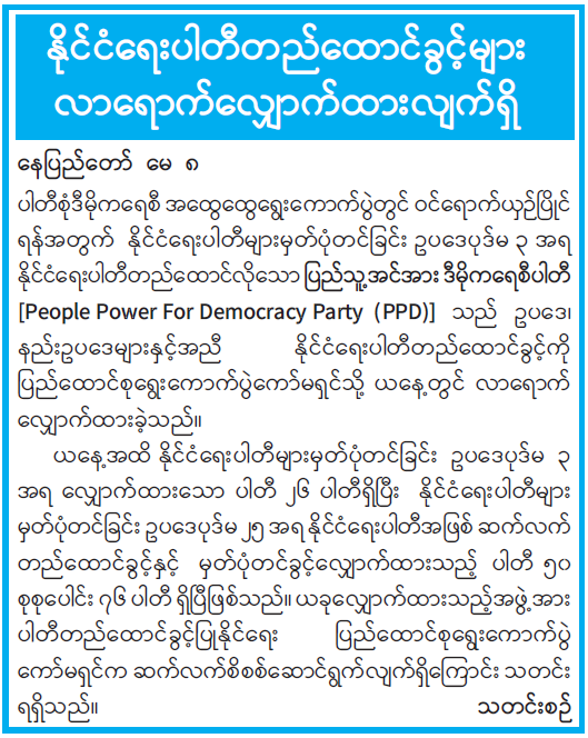 နိုင်ငံရေးပါတီတည်ထောင်ခွင့်များ လာရောက်လျှောက်ထားလျက်ရှိ