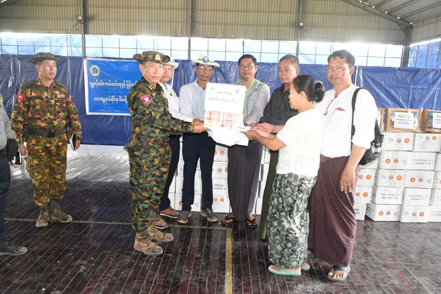 အလားတူ ကာကွယ်ရေးဦးစီးချုပ်ရုံး(ကြည်း)မှ ဒုတိယဗိုလ်ချုပ်ကြီး မျိုးမိုးအောင်နှင့် တာဝန်ရှိသူများသည် မန္တလေးတိုင်းဒေသကြီး၊ အမရပူရမြို့နယ်၊ ဘုံးအိုးကျေးရွာတွင် ဖွင့်လှစ်ထားသော ငလျင်ဘေးသင့်ပြည်သူများ ယာယီကယ်ဆယ်ရေးစခန်းသို့သွားရောက်၍ ဘုံးအိုးကျေးရွာအုပ်စုအတွင်းရှိ ငလျင်ဘေးသင့်ပြည်သူများအား ထောက်ပံ့ပစ္စည်းများပေးအပ်ခြင်း အခမ်းအနားသို့တက်ရောက်ကာ ငလျင်ဘေးသင့်ပြည်သူ အိမ်ထောင်စု (၇၀၀) စာအတွက် ဆန်၊ ဆီ၊ ကုလားပဲစသည့် ထောက်ပံ့ပစ္စည်းများအား ပေးအပ်လှူဒါန်းရာ ငလျင်ဒဏ်သင့်ပြည်သူများကိုယ်စားကျေးရွာမှ တာဝန်ရှိသူတစ်ဦးက လက်ခံရယူသည်။