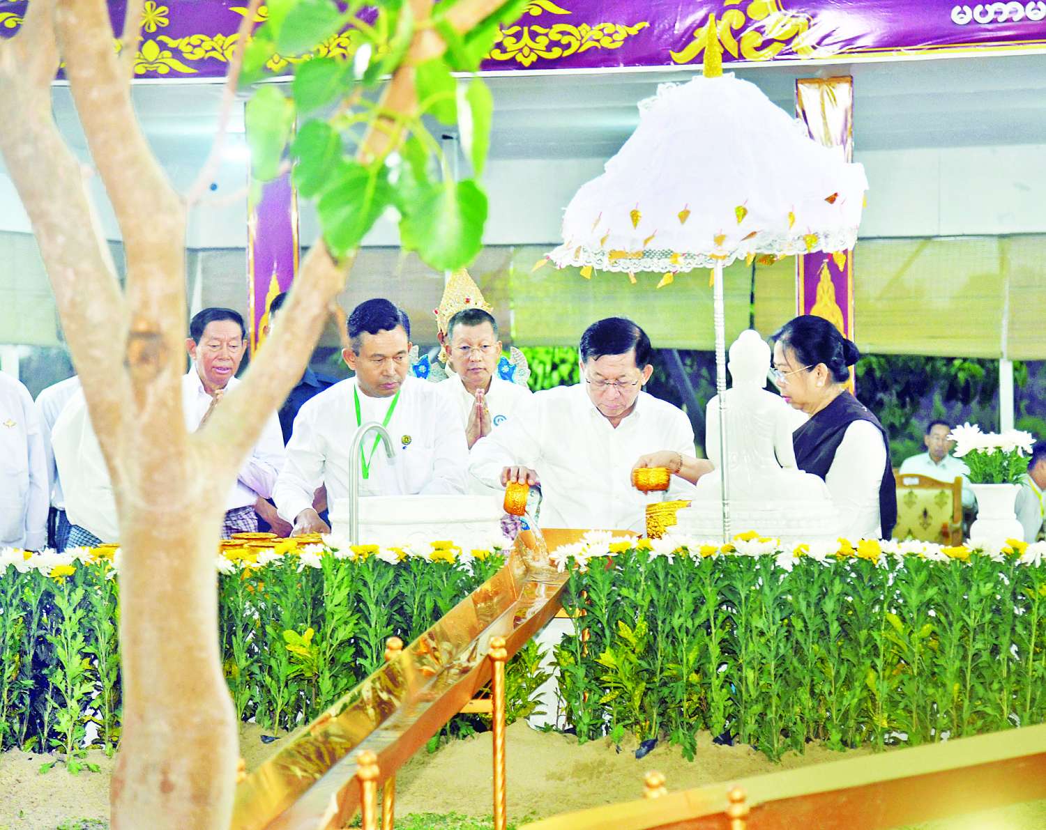 ထို့နောက် နိုင်ငံတော်စီမံအုပ်ချုပ်ရေးကောင်စီဥက္ကဋ္ဌ နိုင်ငံတော်ဝန်ကြီးချုပ်နှင့်ဇနီး၊ နိုင်ငံတော်စီမံအုပ်ချုပ်ရေးကောင်စီဒုတိယဥက္ကဋ္ဌ ဒုတိယဝန်ကြီးချုပ်နှင့်ဇနီး၊ ကောင်စီအတွင်းရေးမှူးနှင့်ဇနီး၊ ကောင်စီတွဲဖက်အတွင်းရေးမှူးနှင့်ဇနီး၊ ကောင်စီဝင်များနှင့်ဇနီးများ၊ ပြည်ထောင်စုအဆင့် ပုဂ္ဂိုလ်များနှင့်ဇနီးများသည် သတ်မှတ်ထားသည့် နေရာများအလိုက် နေရာယူကြပြီး မဟာဗောဓိညောင်ပင်တော်အား အမွှေးနံ့သာရည်များ ပက်ဖျန်းပူဇော်ကာ ညောင်ရေသွန်းလောင်းပူဇော်ကြသည်။ ဆက်လက်၍ မဟာဗောဓိညောင်ပင်တော်ရှိ ဗုဒ္ဓရုပ်ပွားတော်မြတ်များအား ရေသပ္ပာယ်တော်မူကြပြီး မဟာဗောဓိညောင်ပင်တော်အား လက်ယာရစ် လှည့်လည်ပူဇော်ကြသည်။