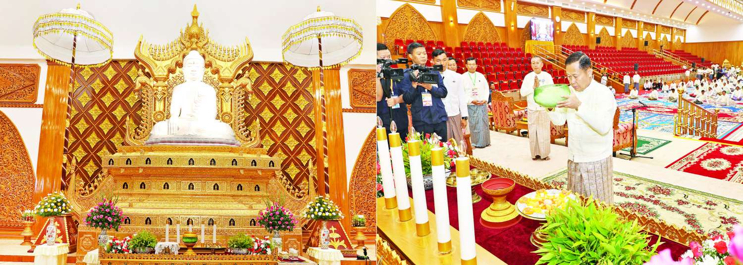 ထို့နောက် အခမ်းအနားကို နမောတဿ သုံးကြိမ်ရွတ်ဆို ဘုရားကန်တော့ဖွင့်လှစ်၍ နိုင်ငံတော် စီမံအုပ်ချုပ်ရေးကောင်စီ ဒုတိယဥက္ကဋ္ဌ ဒုတိယဝန်ကြီးချုပ်နှင့်ဇနီး အမှူးပြုသော ဧည့်ပရိသတ်များက နိုင်ငံတော်သံဃမဟာ နာယကအဖွဲ့ဥက္ကဋ္ဌ ဒေါက်တာ ဘဒ္ဒန္တစန္ဒိမာဘိဝံသထံမှ ကိုးပါးသီလ ခံယူဆောက်တည်ကြပြီး သံဃာတော်အရှင်သူမြတ်များ ရွတ်ပွားသရဇ္ဈာယ်တော်မူသော မေတ္တသုတ် ပရိတ်တရားတော်များကို နာယူကြည်ညိုကြသည်။